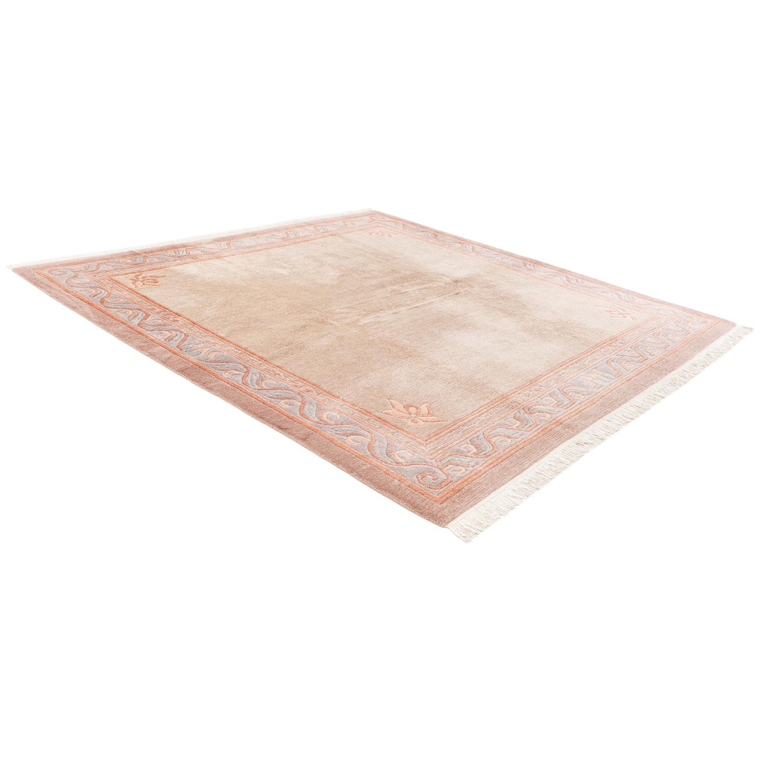 A 7' 6 x 7' 7 square ivory wool rug with a modern oriental border in muted peach and gray tones, featuring floral corner accents.
