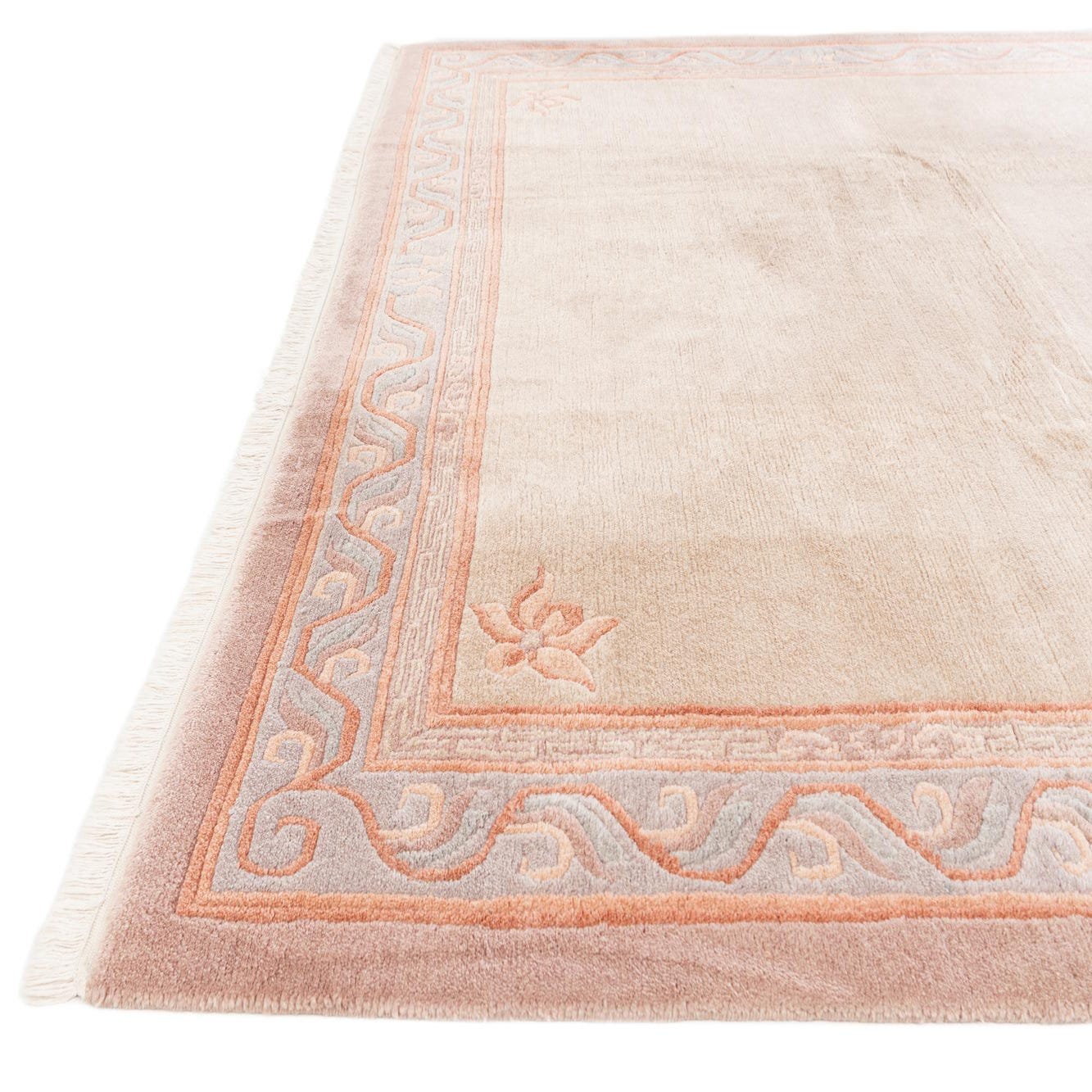 A soft, hand-knotted 100% wool rug with a low, velvety pile and subtle sheen, this piece presents a broad light beige field framed by a narrow inner stripe and a decorative outer border. The border carries a flowing, scroll-like motif in peach and light blue, with small floral corner accents in pink and violet that add gentle color without overwhelming the composition. The wool pile feels dense and smooth underfoot, and the short fringe at the ends provides a finished, classic touch.