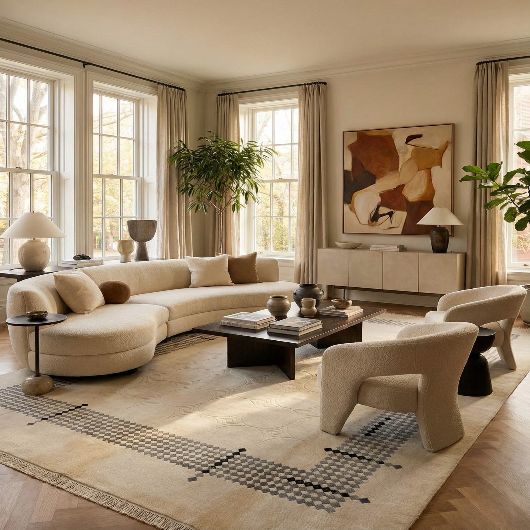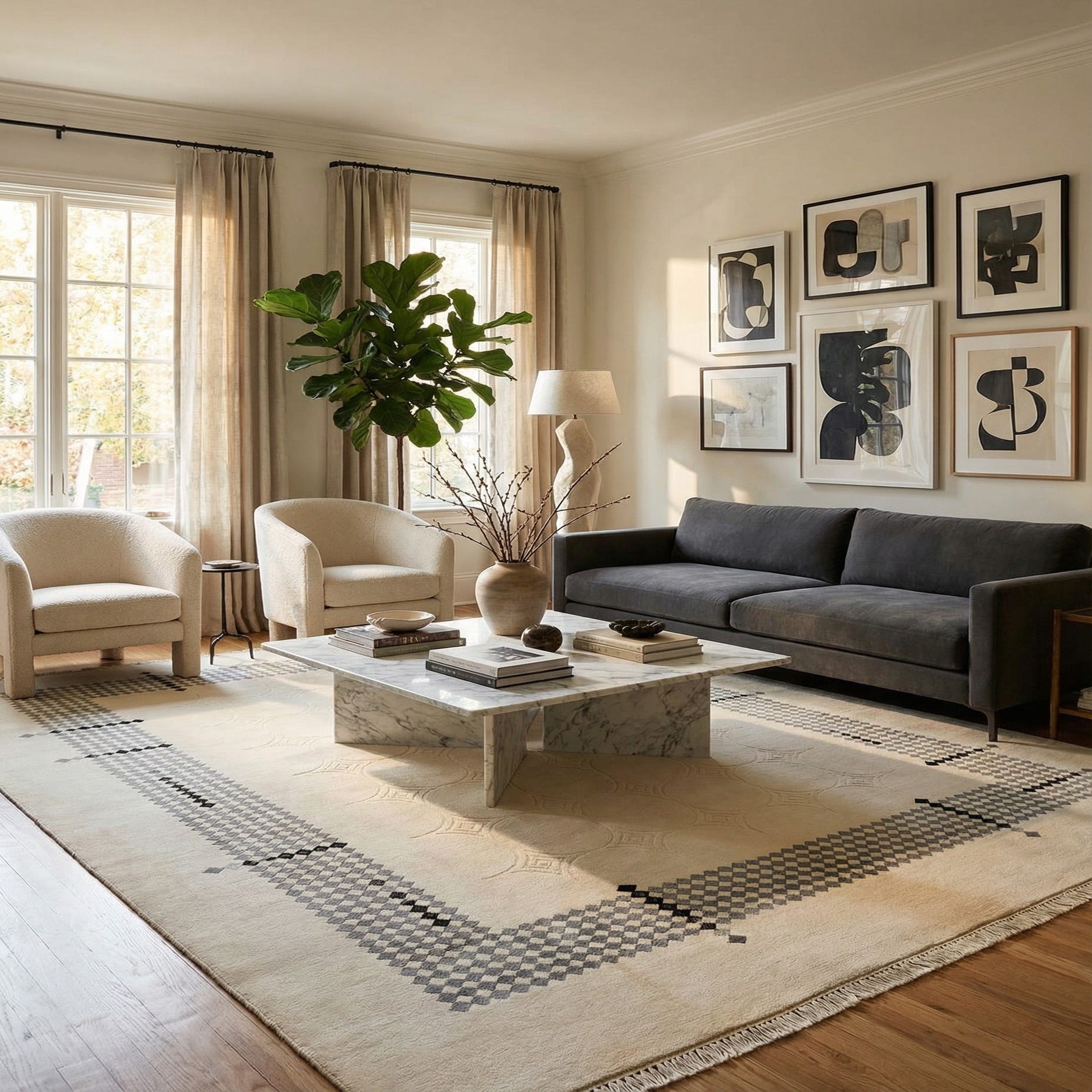 An 8x10 rectangular ivory wool rug with a modern geometric border in varying shades of gray and black diamonds.
