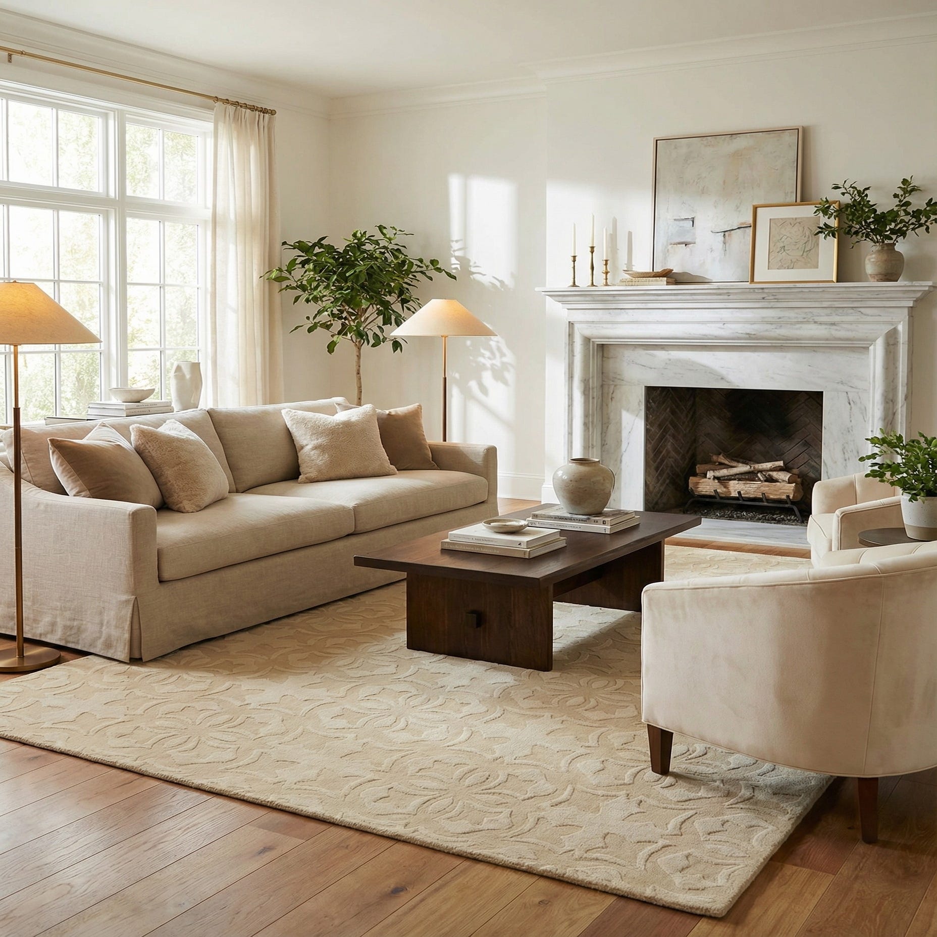 An 8x10 rectangular ivory area rug with a subtle, raised abstract pattern, perfect for a living room.