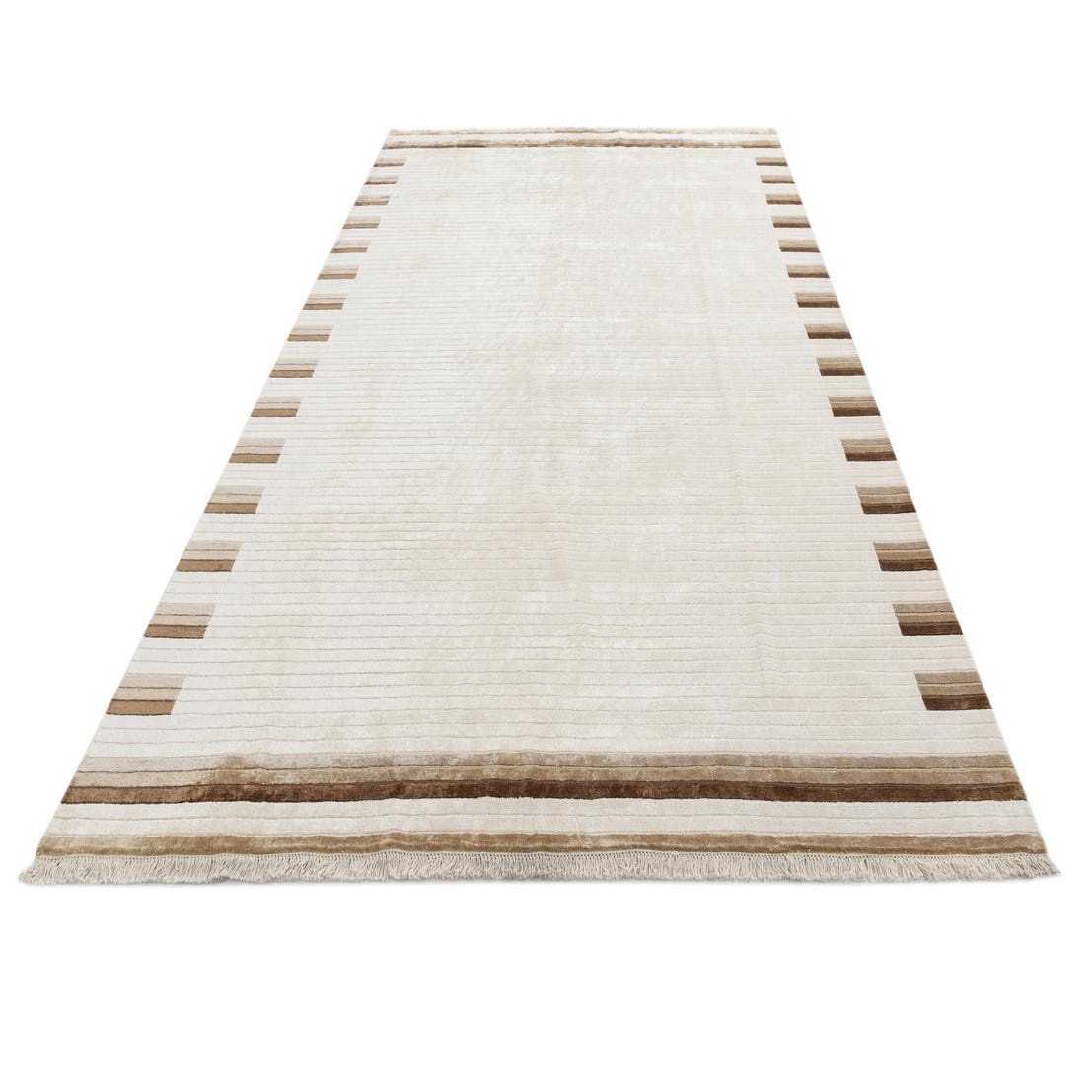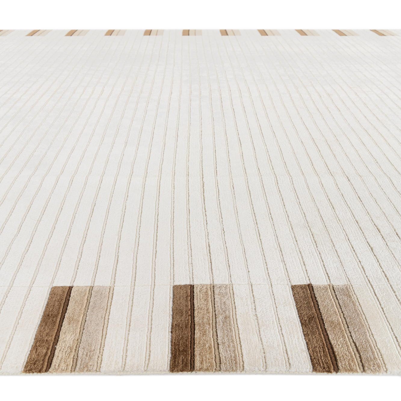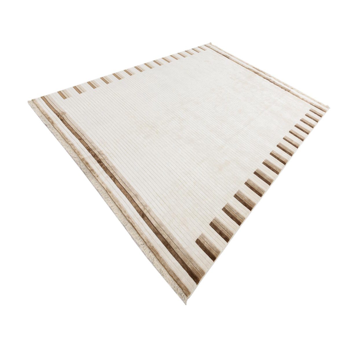 An 8x11 rectangular ivory wool rug with a subtle striped texture and a wide border featuring horizontal stripes in varying shades of brown and cream.