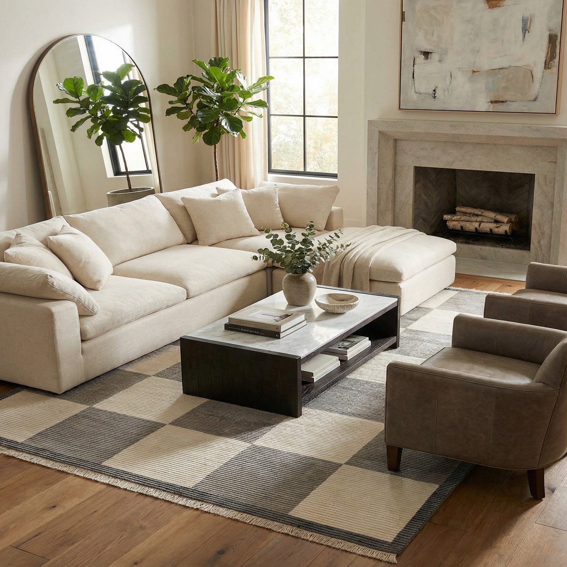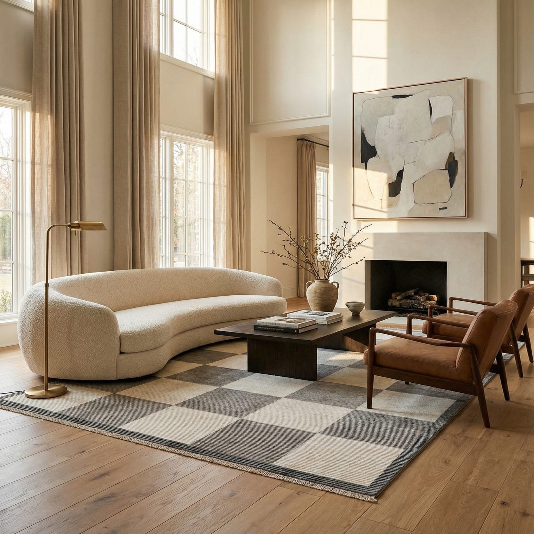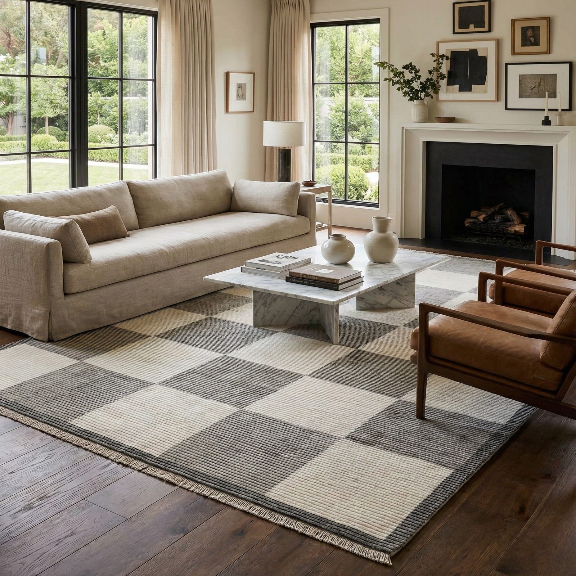 A large 8x11 rectangular Darya rug with a modern checkerboard pattern in ivory and light gray, featuring a high pile and subtle fringe.