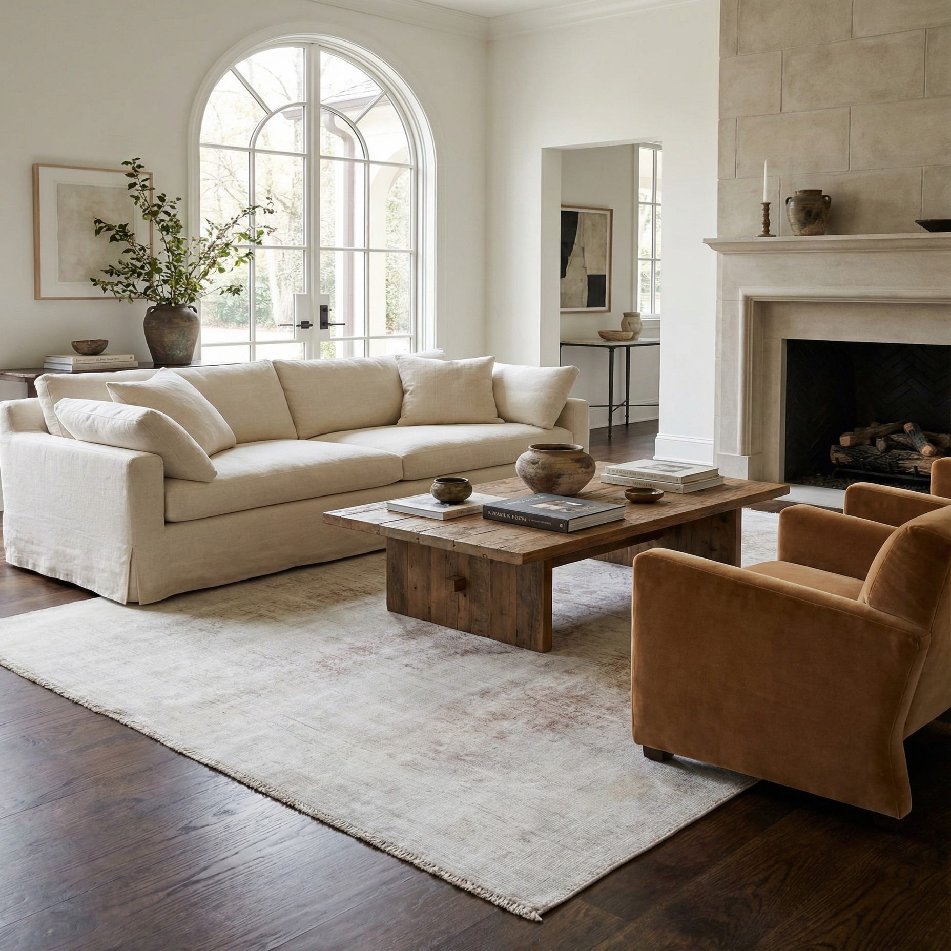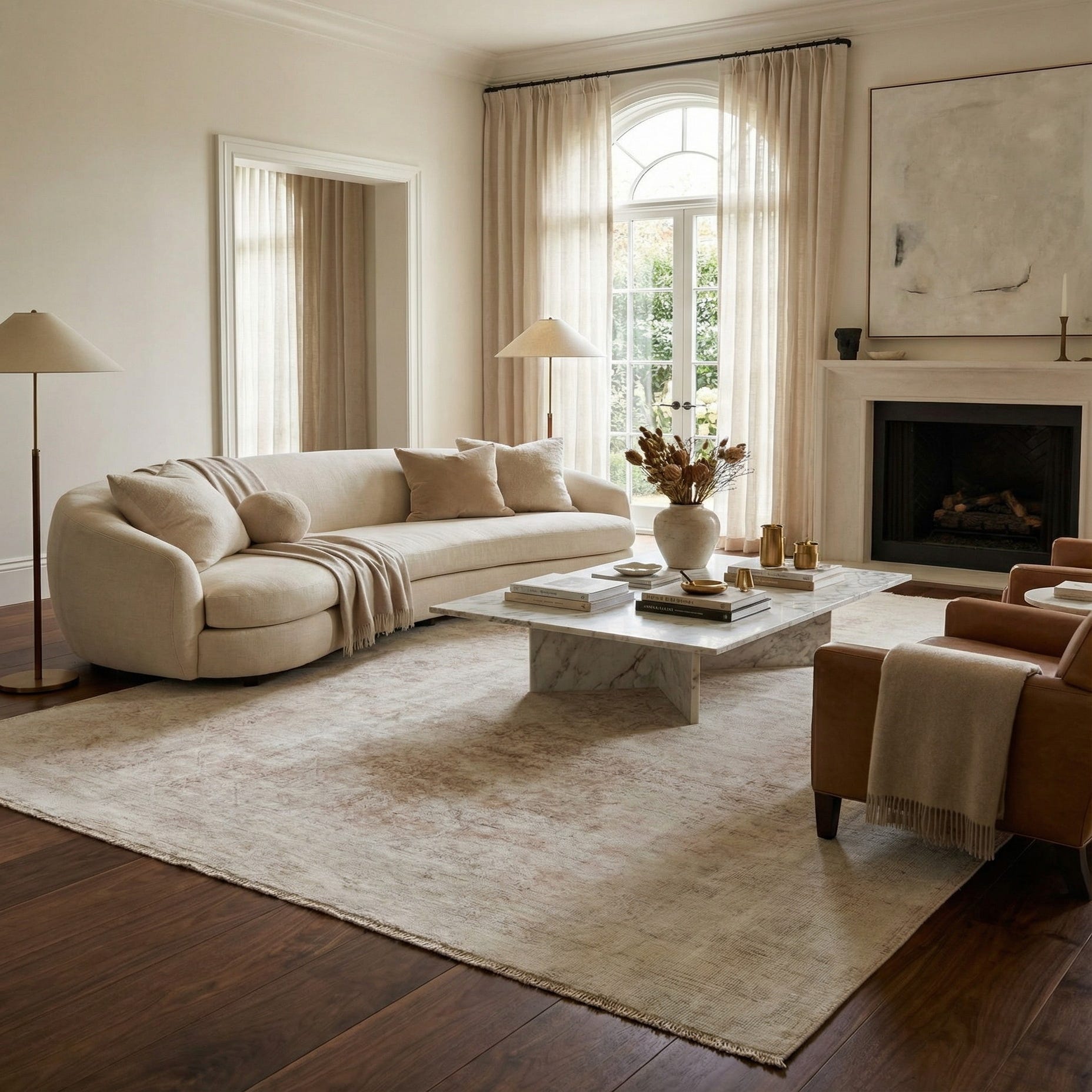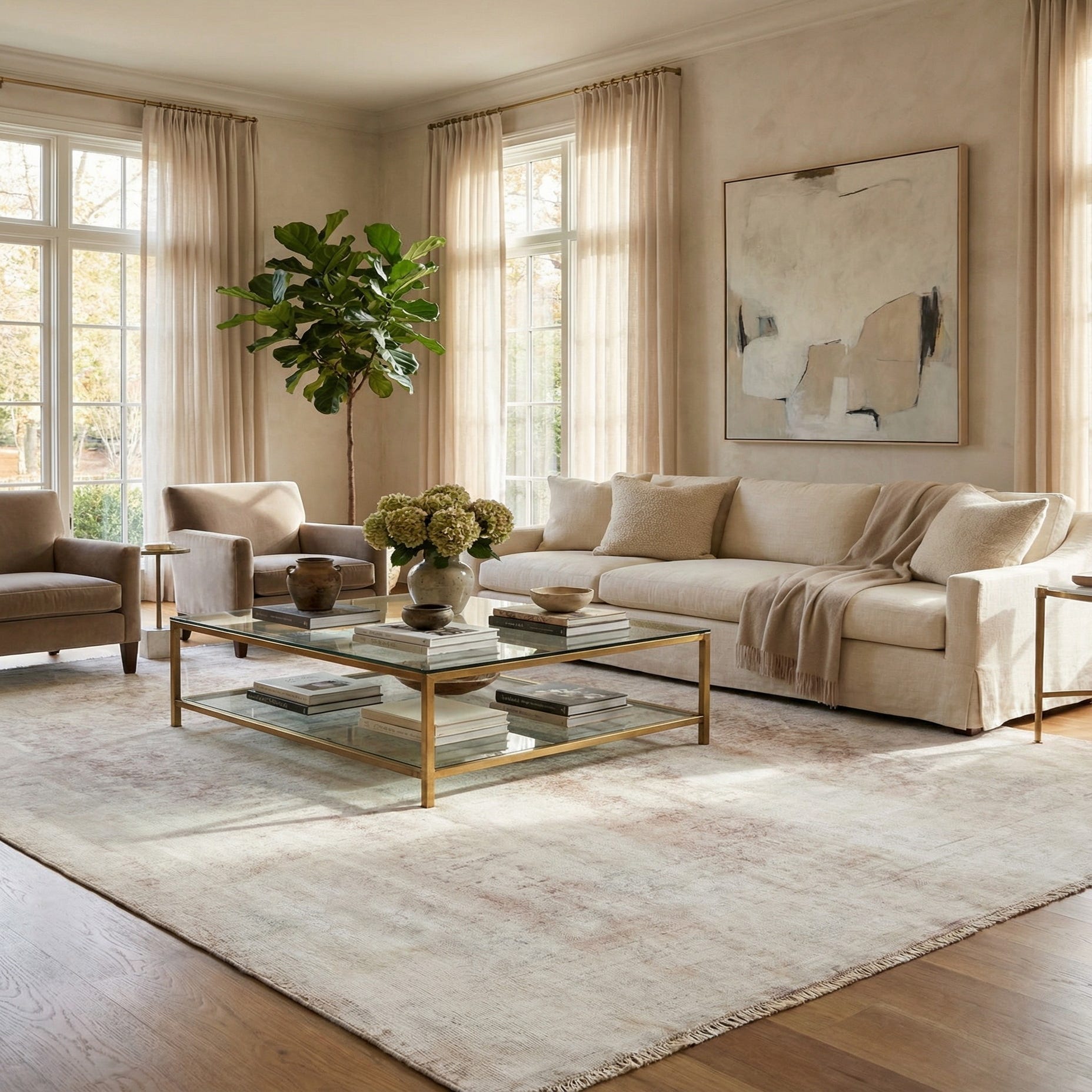 This rug works well as an anchor for a relaxed living room seating group, layered beneath a bed to add quiet texture, or under a dining table where a neutral palette is desired. Pair it with warm woods and leather for a modern farmhouse or transitional scheme, or let it soften a contemporary, minimalist space with linen upholstery and clean-lined furniture. It also complements Scandinavian and coastal interiors that favor light, airy color stories.
