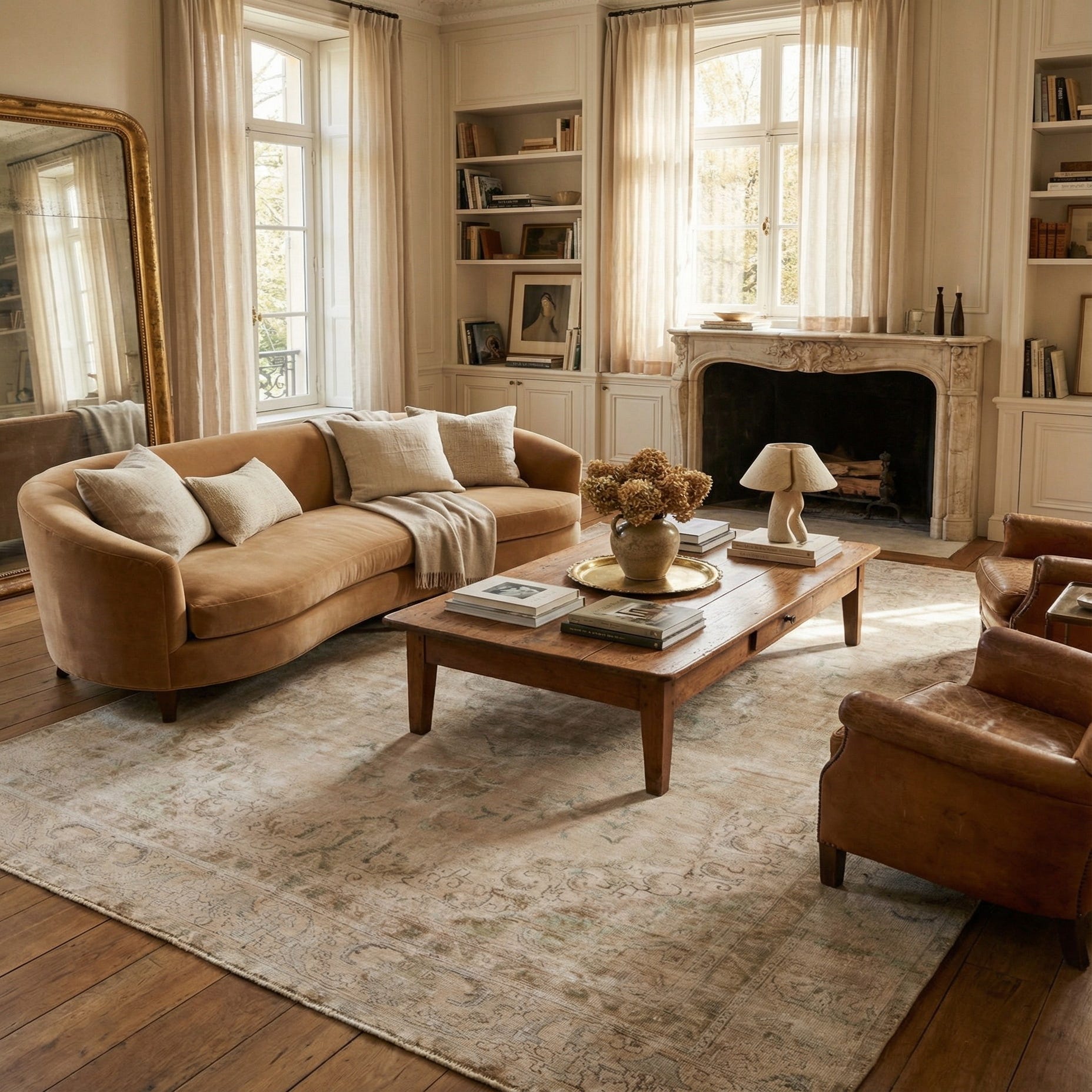 An 8x11 rectangular ivory and cream Persian-style rug with a faded medallion pattern, ideal for a living room.
