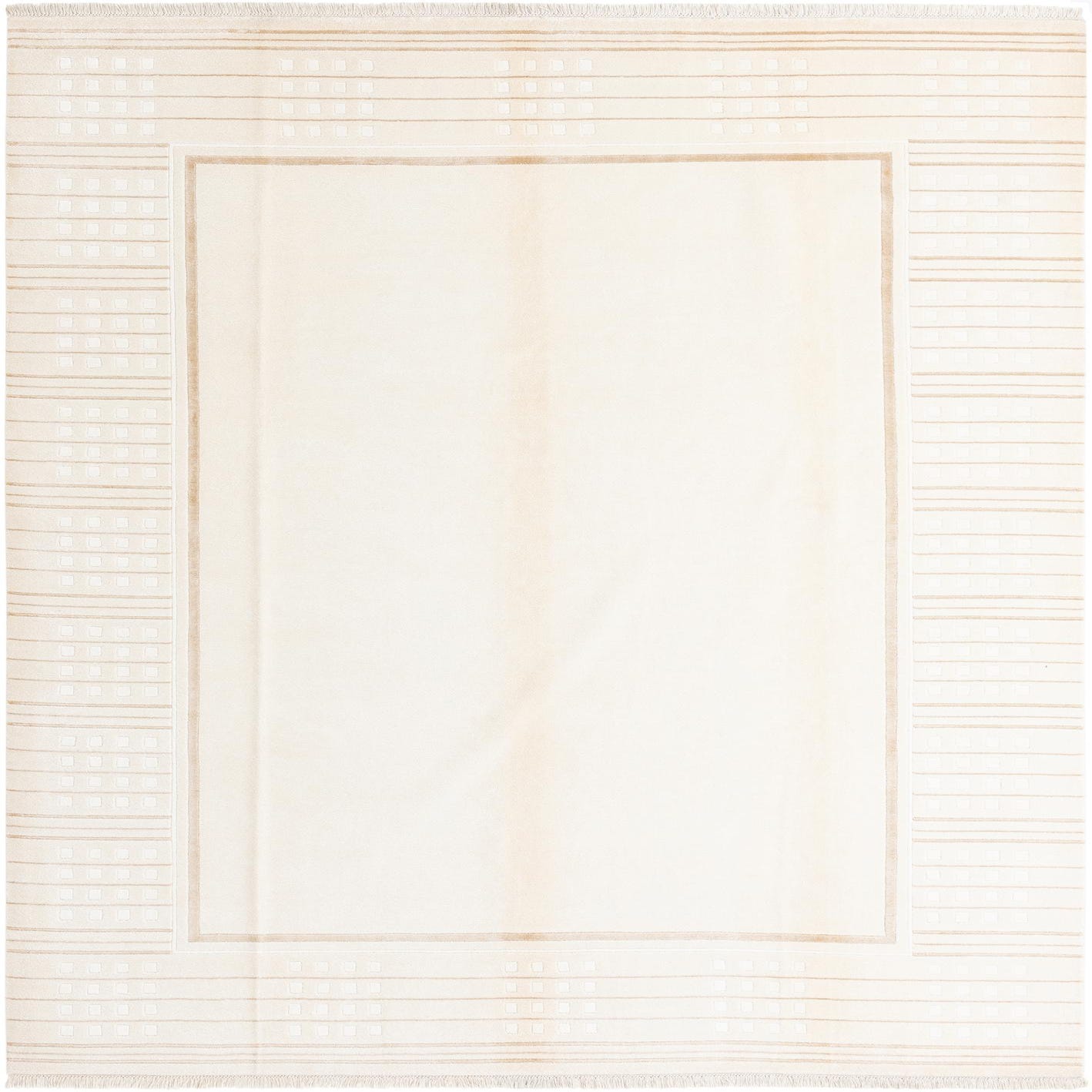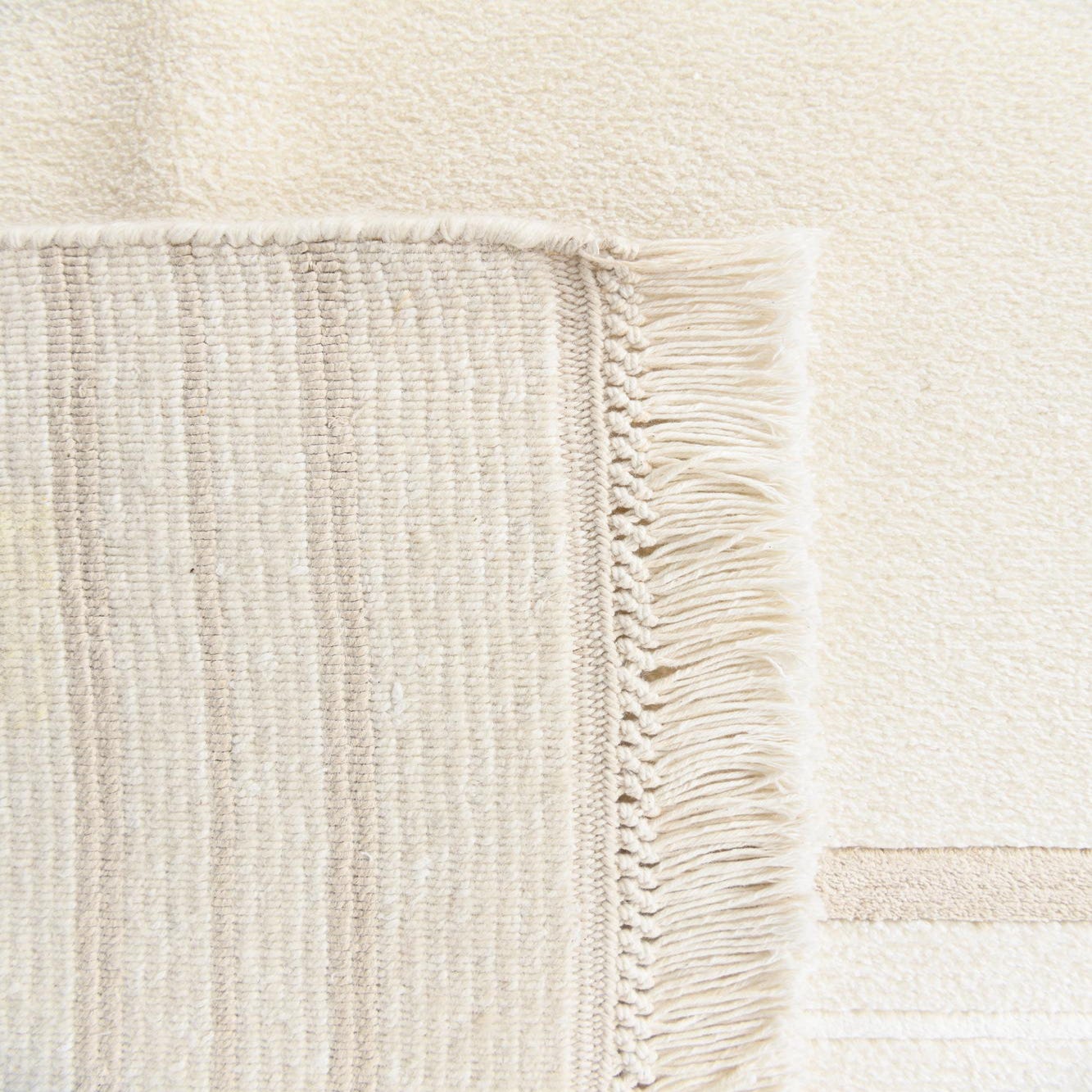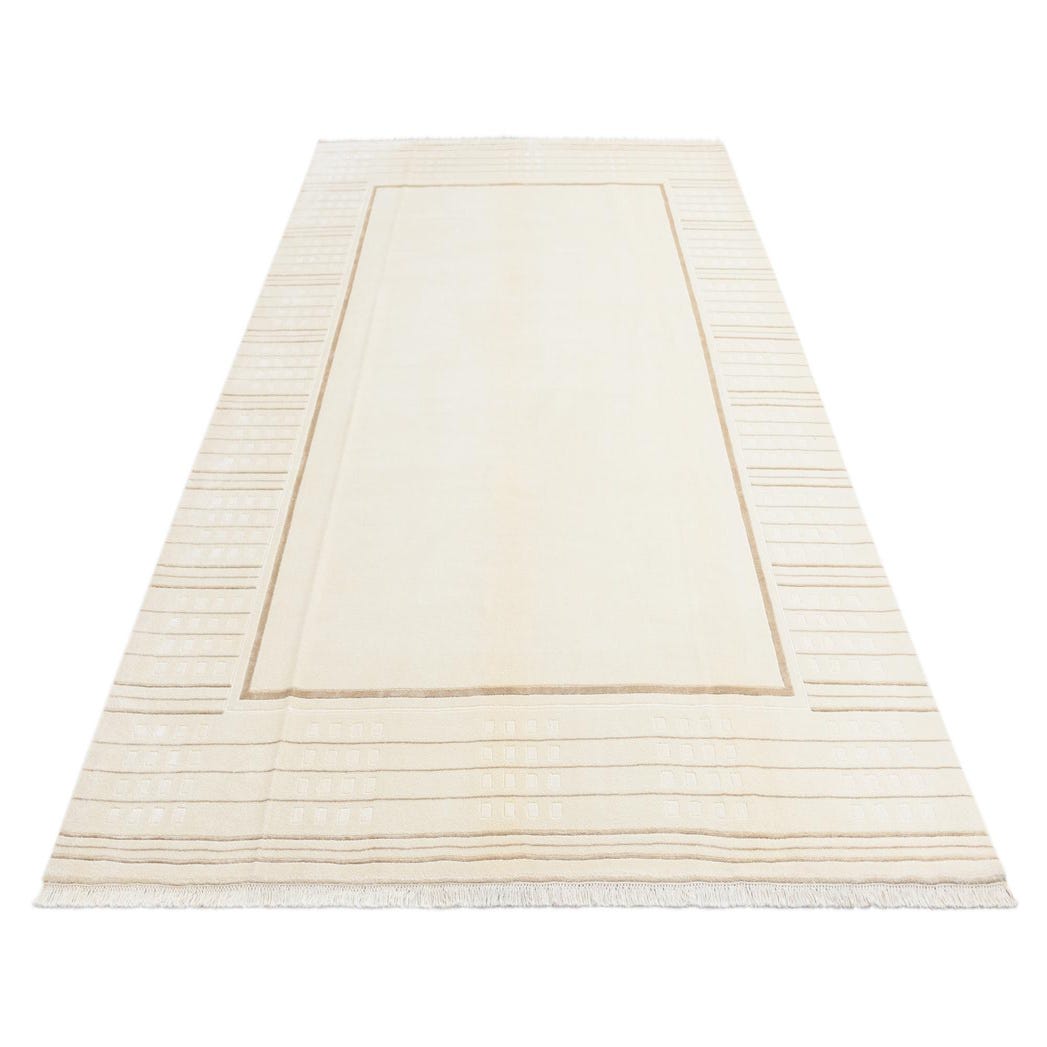 Boasting a minimalist design, the rug's pattern is composed of elegant geometric lines and subtle squares that create a border-like effect. The simplicity of the design allows for versatility in styling, making it an ideal choice for interiors ranging from modern to traditional. The textural depth is highlighted by the skillful hand-knotting technique, which ensures a tactile surface that contributes to the overall sensory experience of the space.