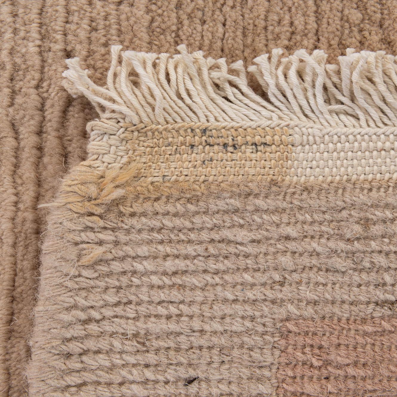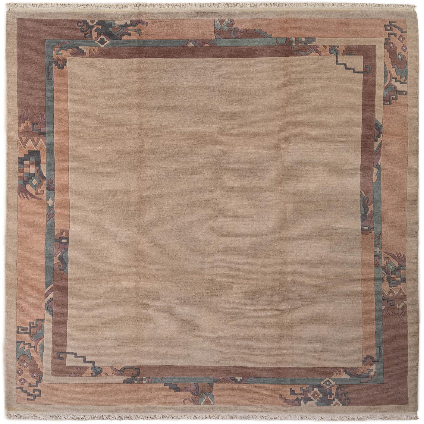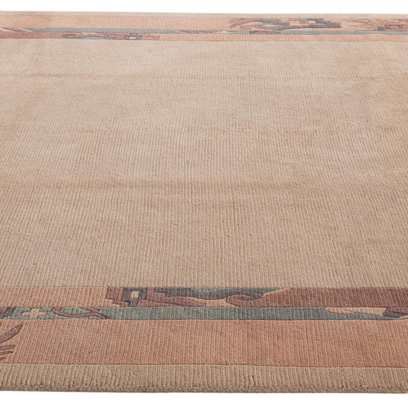 An 8x12 rectangular ivory wool rug with a modern oriental border in muted browns, blues, and creams.