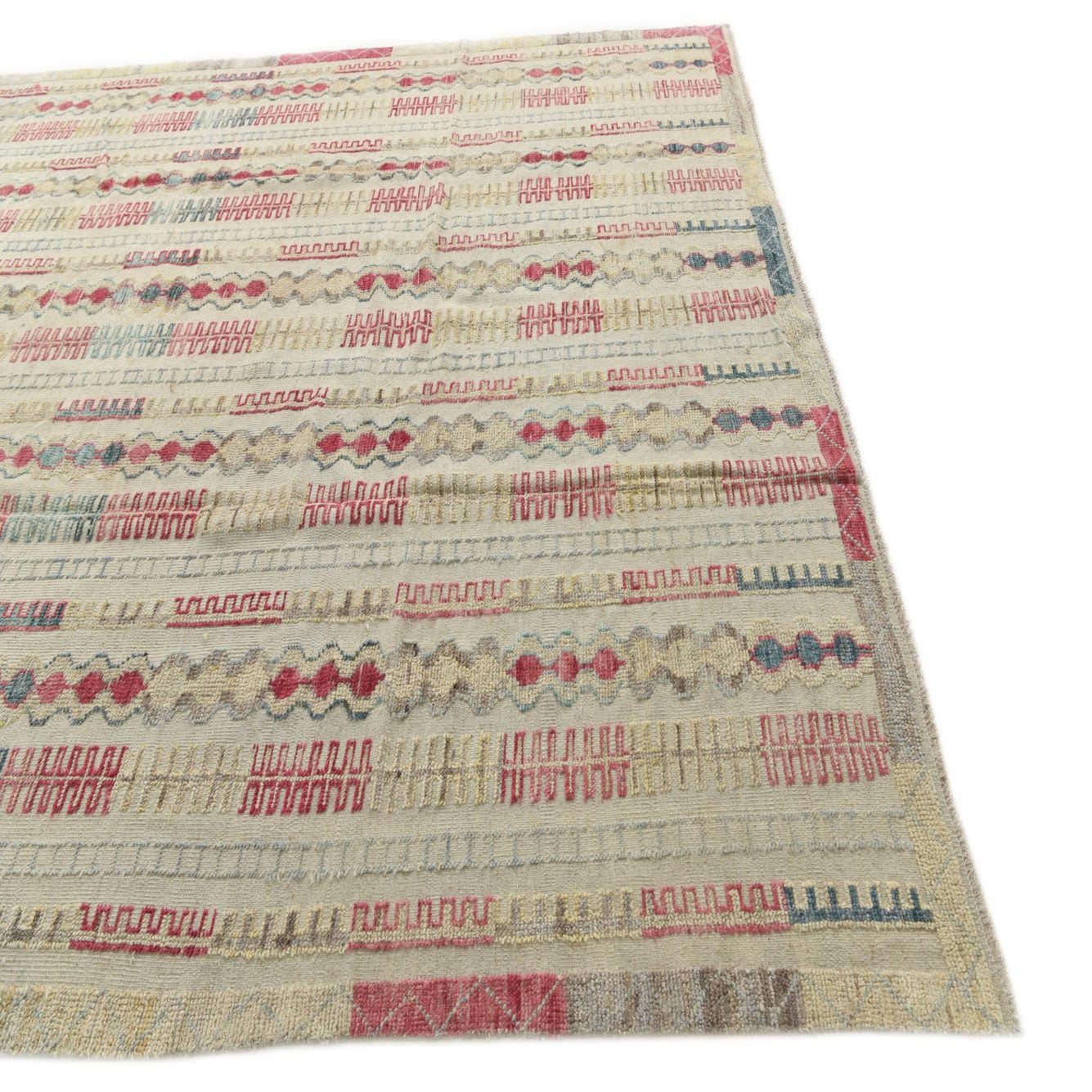 A 9x12 rectangular Darya rug with an ivory base and vertical stripes of modern abstract patterns in red, blue, and orange.