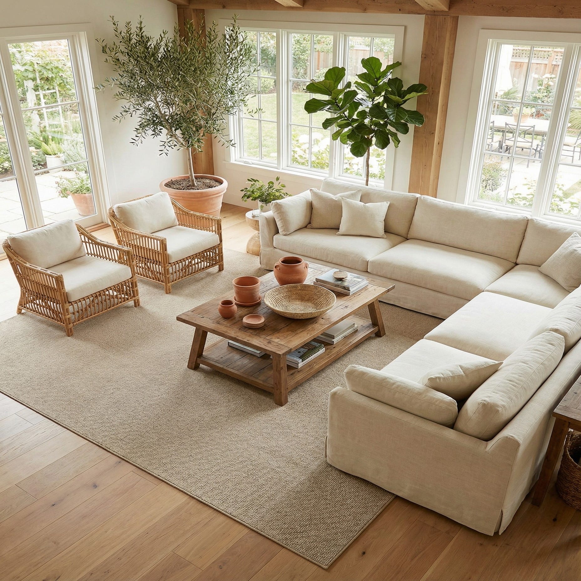 A large 9x12 rectangular ivory modern solid rug, suitable for indoor or outdoor use.