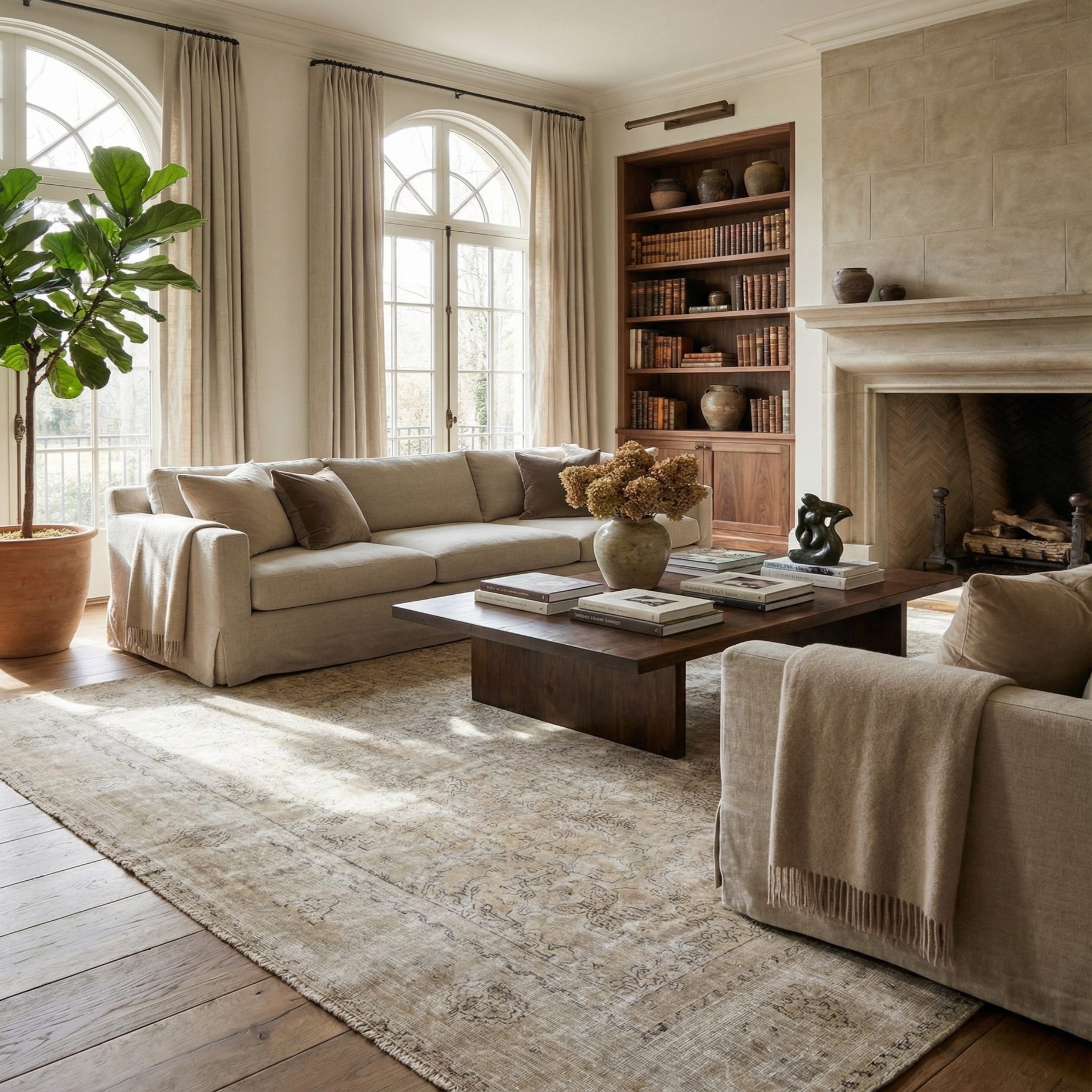 A large 9x12 rectangular ivory and cream Persian rug with a faded medallion pattern, suitable for a living room.