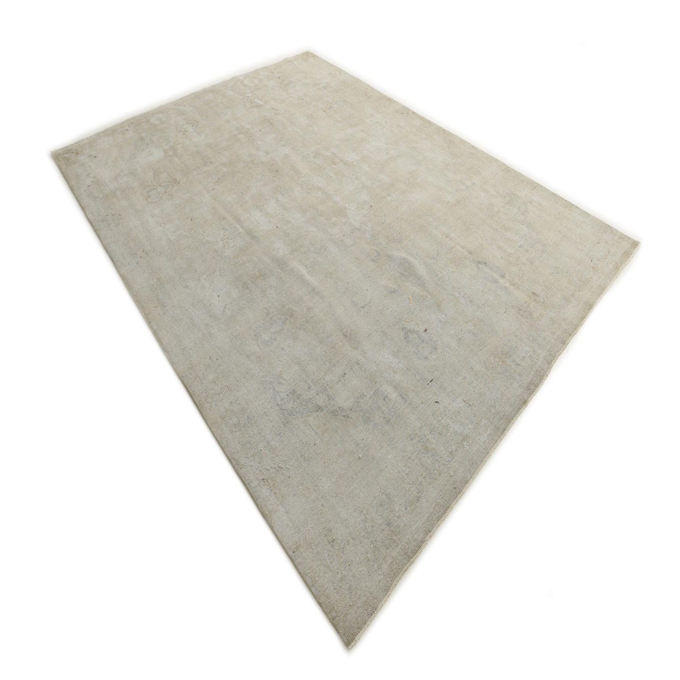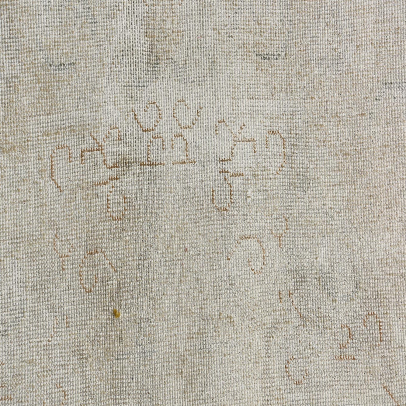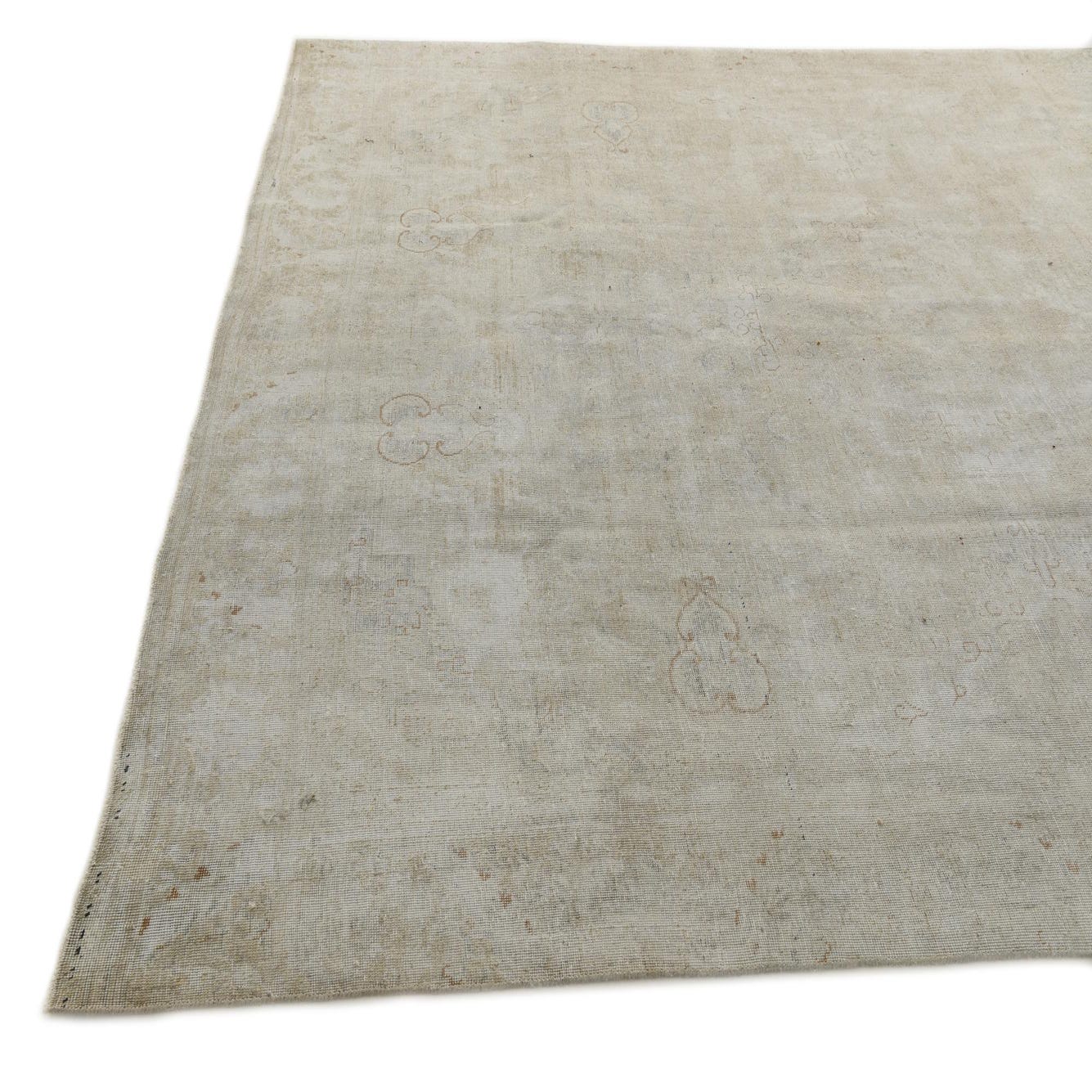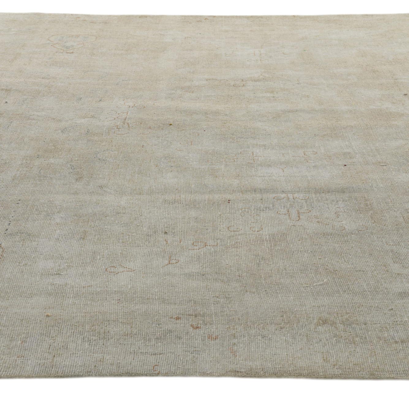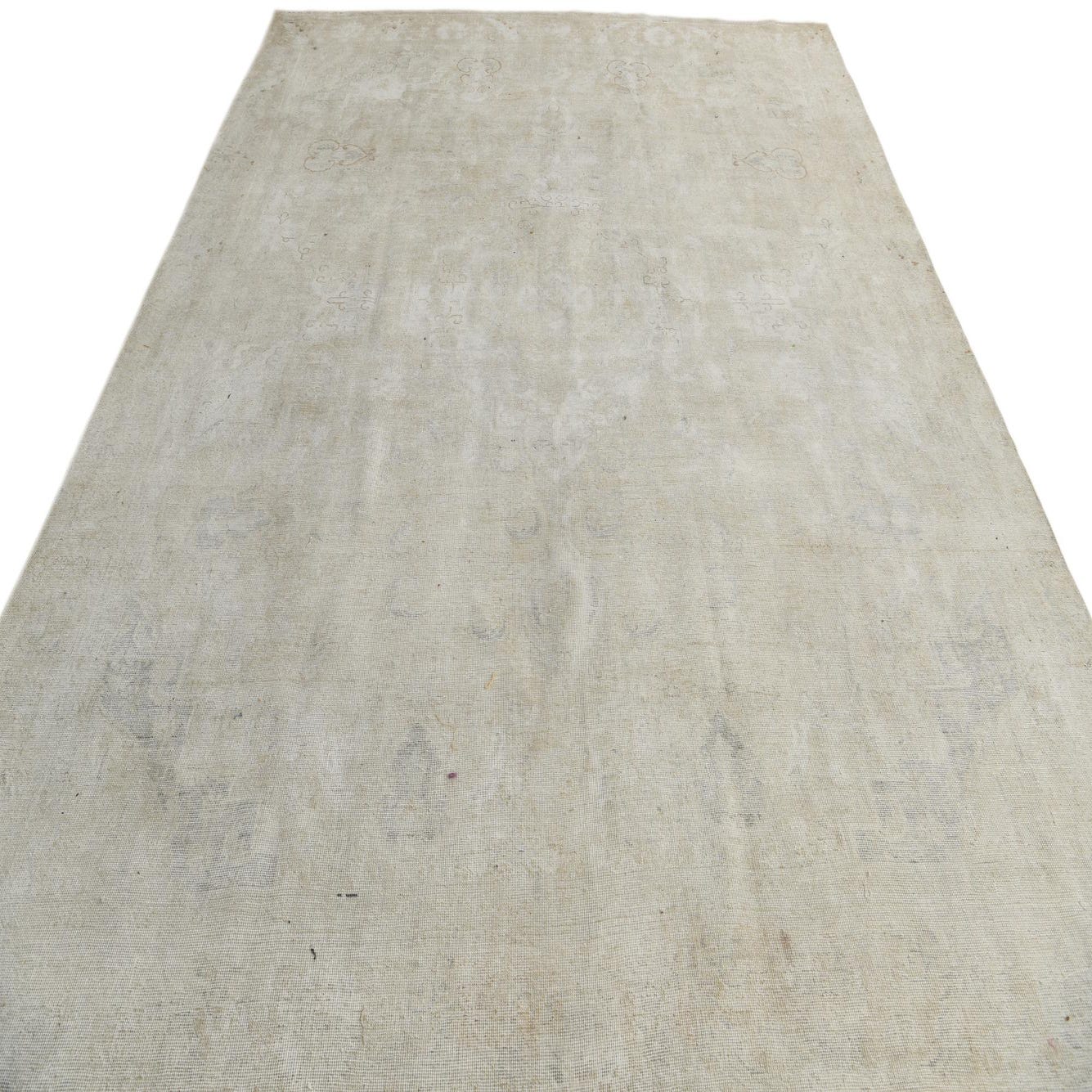 A softly faded vintage motif rests on a light beige ground, with whisper-thin medallions and cartouche shapes worked in warm brown and ivory. The pattern is intentionally muted—an open, washed field with a barely-there border that lets the neutral palette do the visual work. Hand-knotted construction gives the design subtle irregularities and a gently aged patina that reads as authentic, timeworn character.