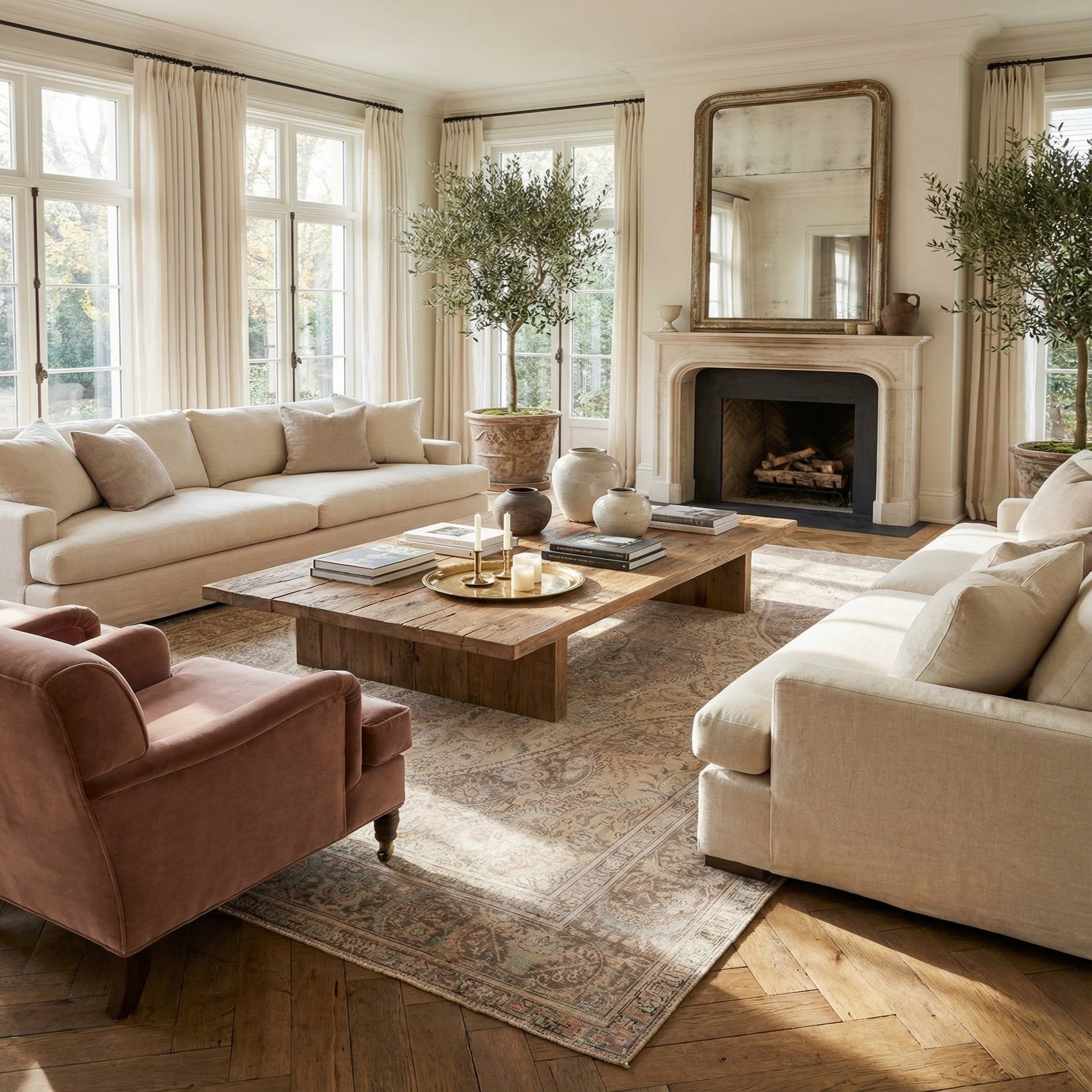 A 9x12 rectangular ivory and cream Persian rug with a faded medallion pattern, suitable for a living room.