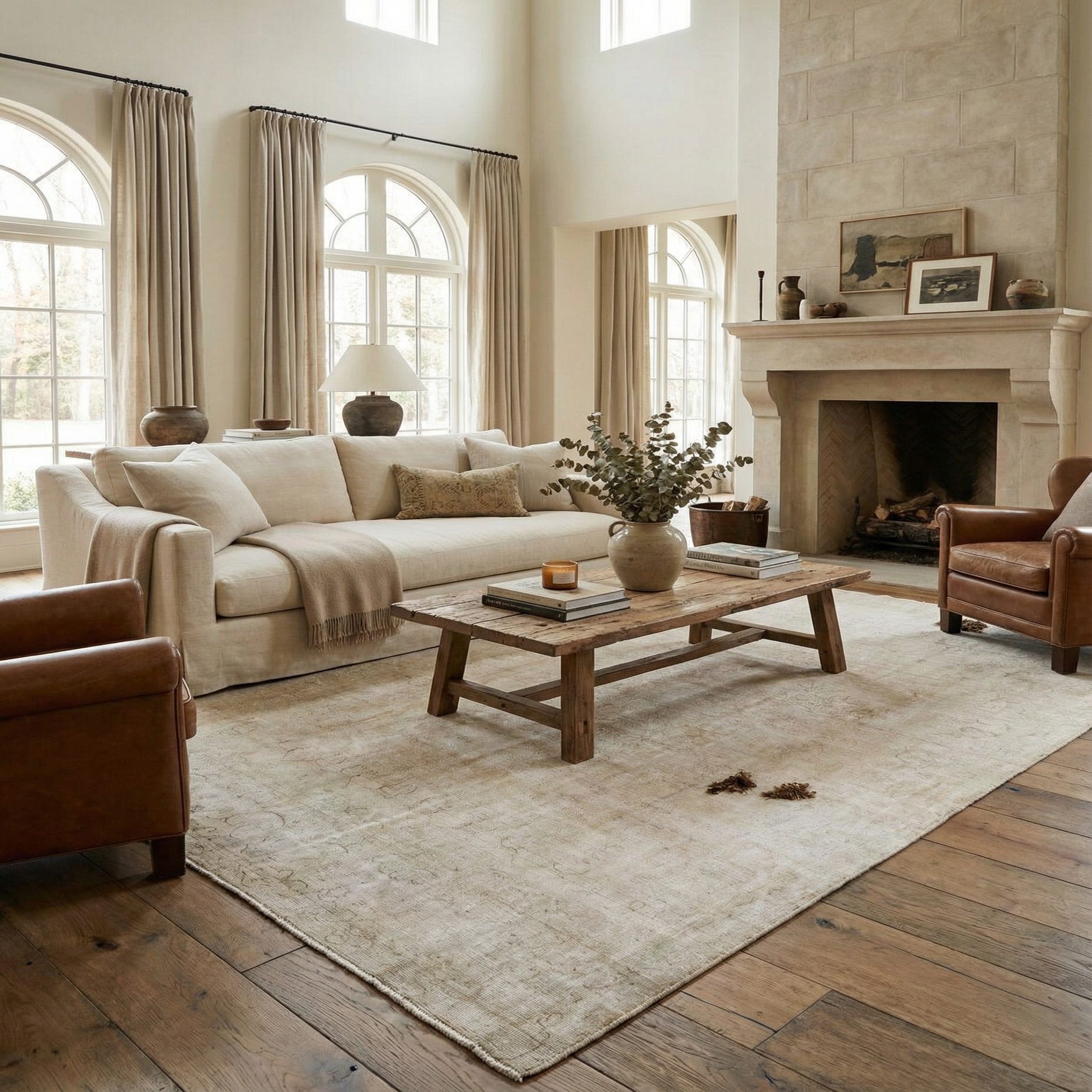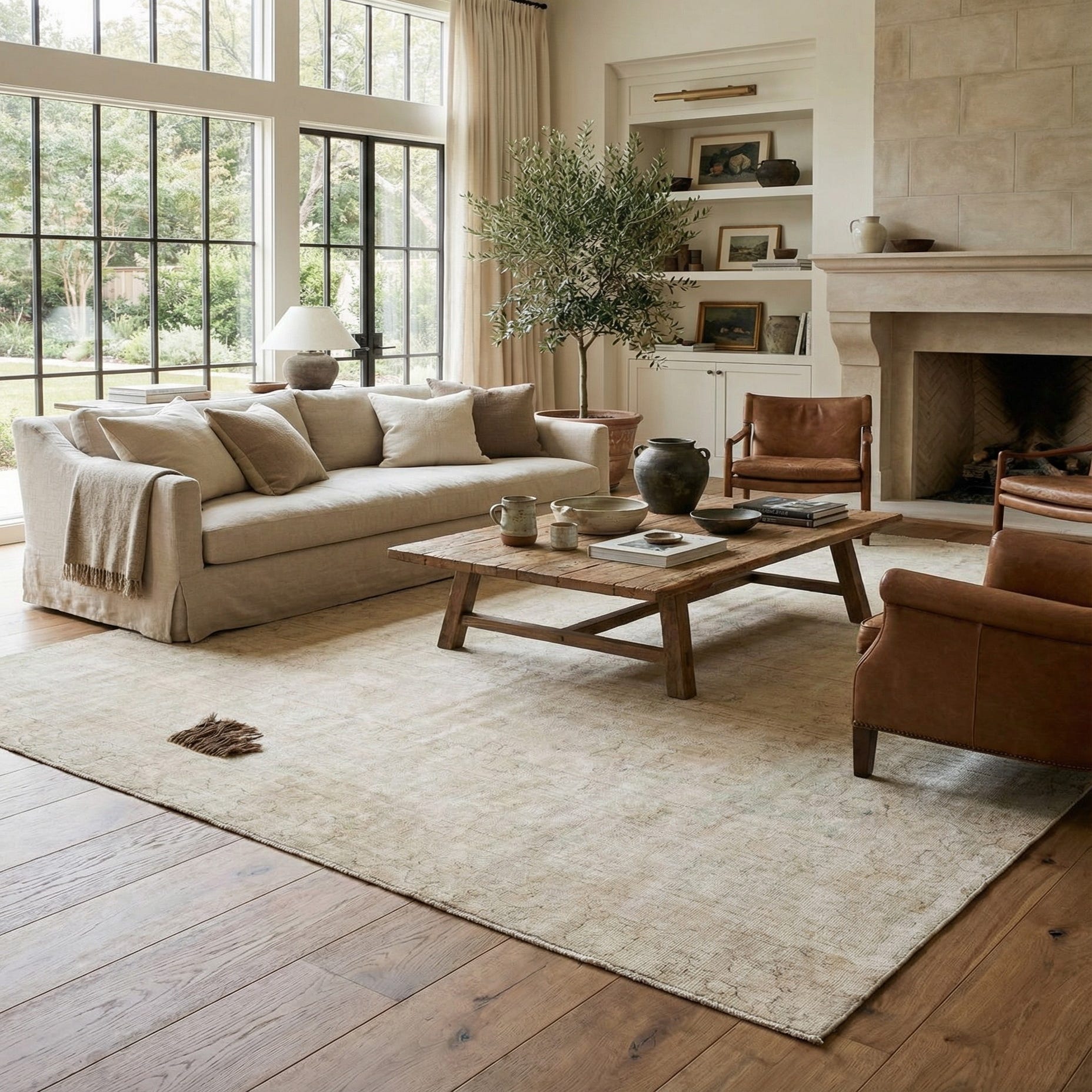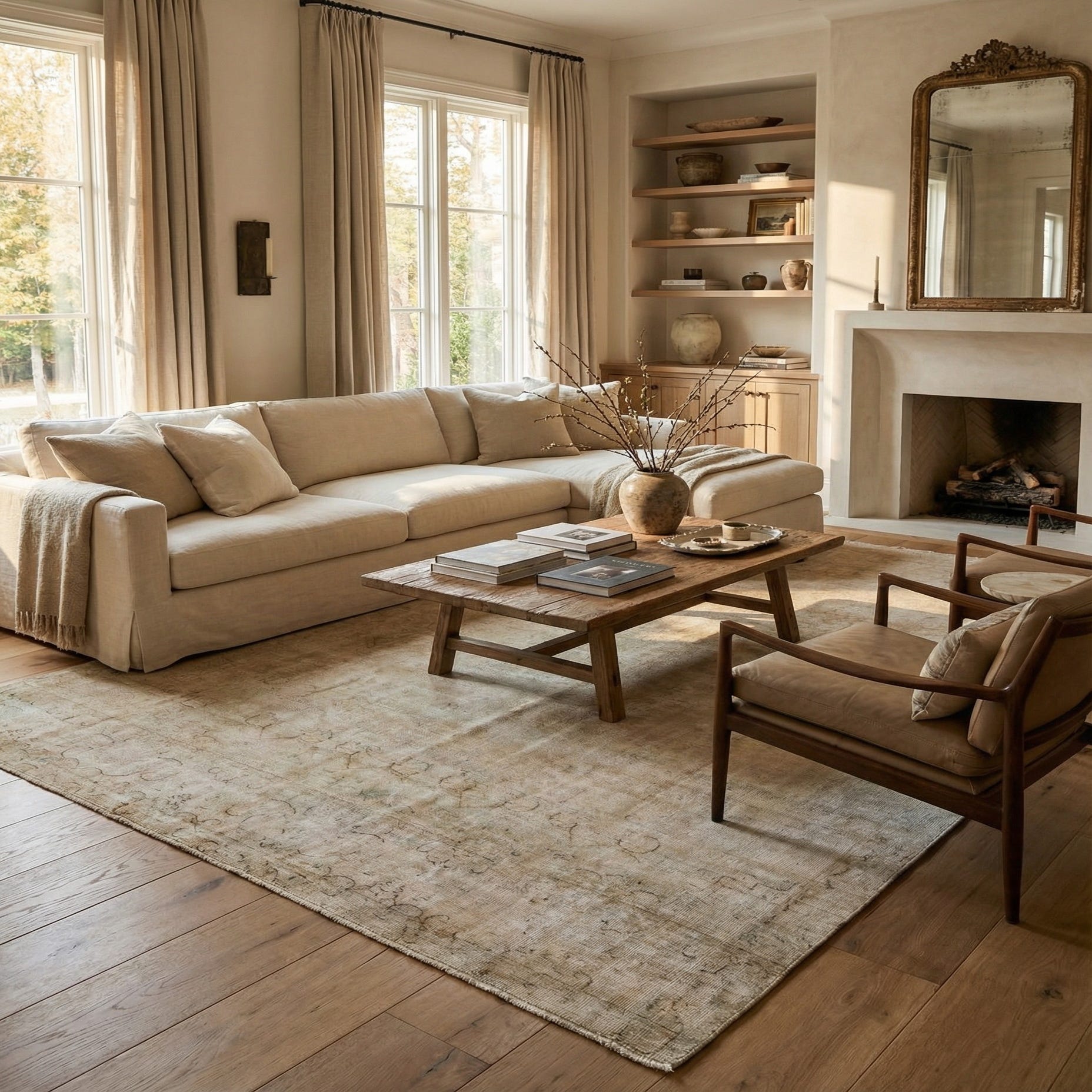 A 9x12 rectangular ivory wool rug with a subtle Persian medallion pattern and flat pile, suitable for a living room.