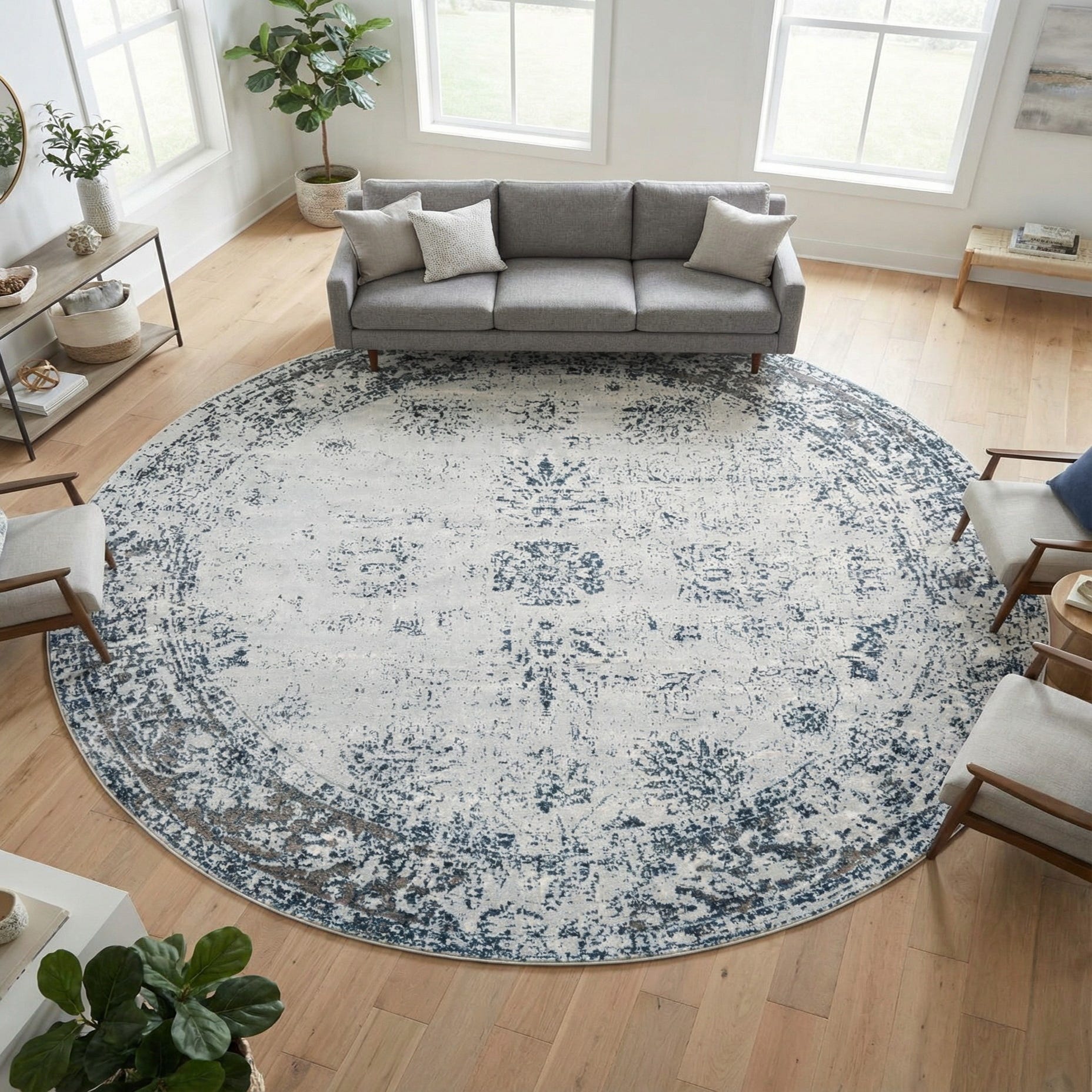 A light blue ground sets a cool, calming stage for this round rug, where ivory and gray motifs are gently distressed across the surface. The design centers on a faded medallion with soft concentric borders and scattered speckling that give the piece a lived-in, vintage character. Woven from 100% polypropylene, the rug has a low-profile pile that feels smooth underfoot with a faint, satiny sheen—comfortable to touch and easy to layer into a room.