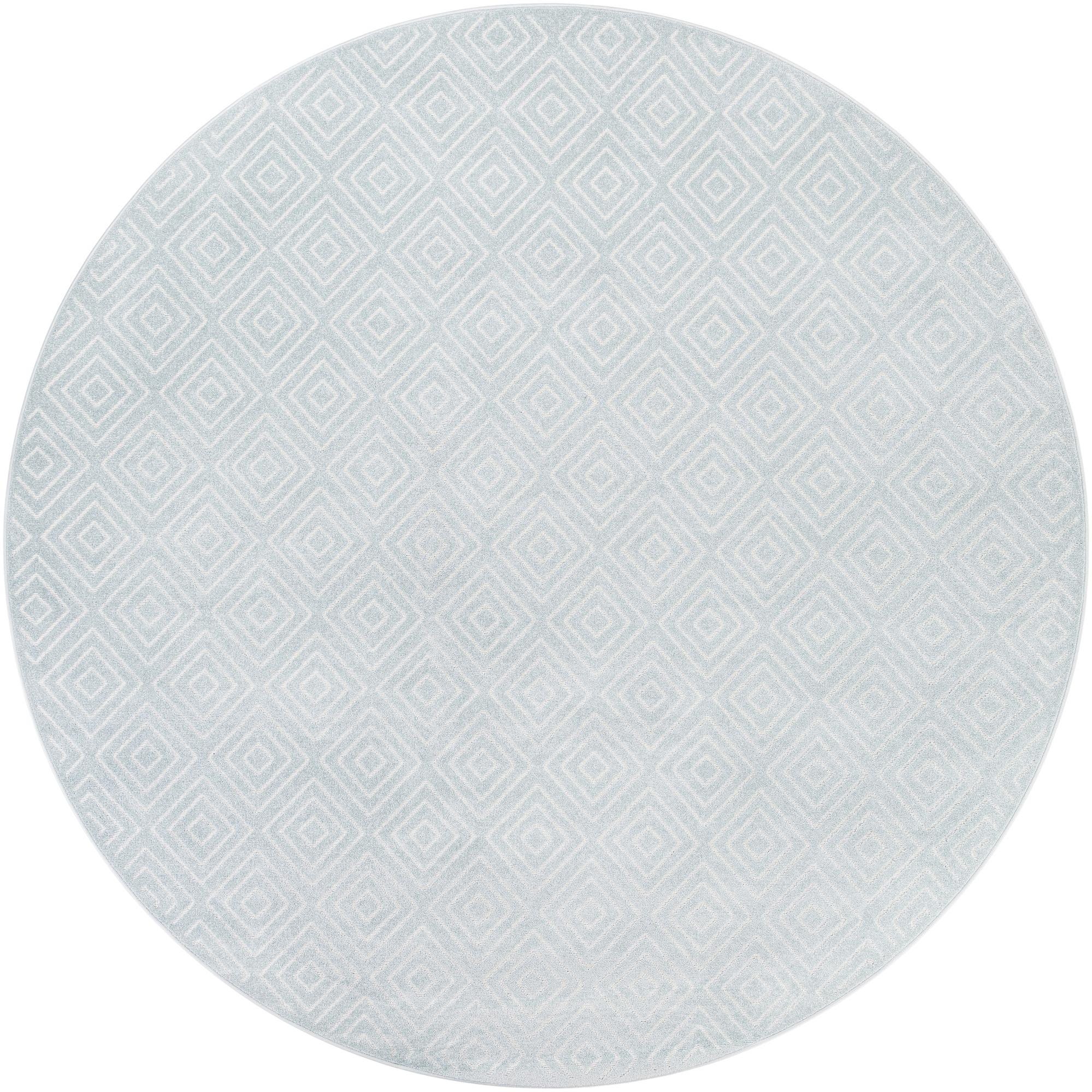 A light blue round rug with a repeating white geometric diamond pattern, suitable for indoor or outdoor spaces.