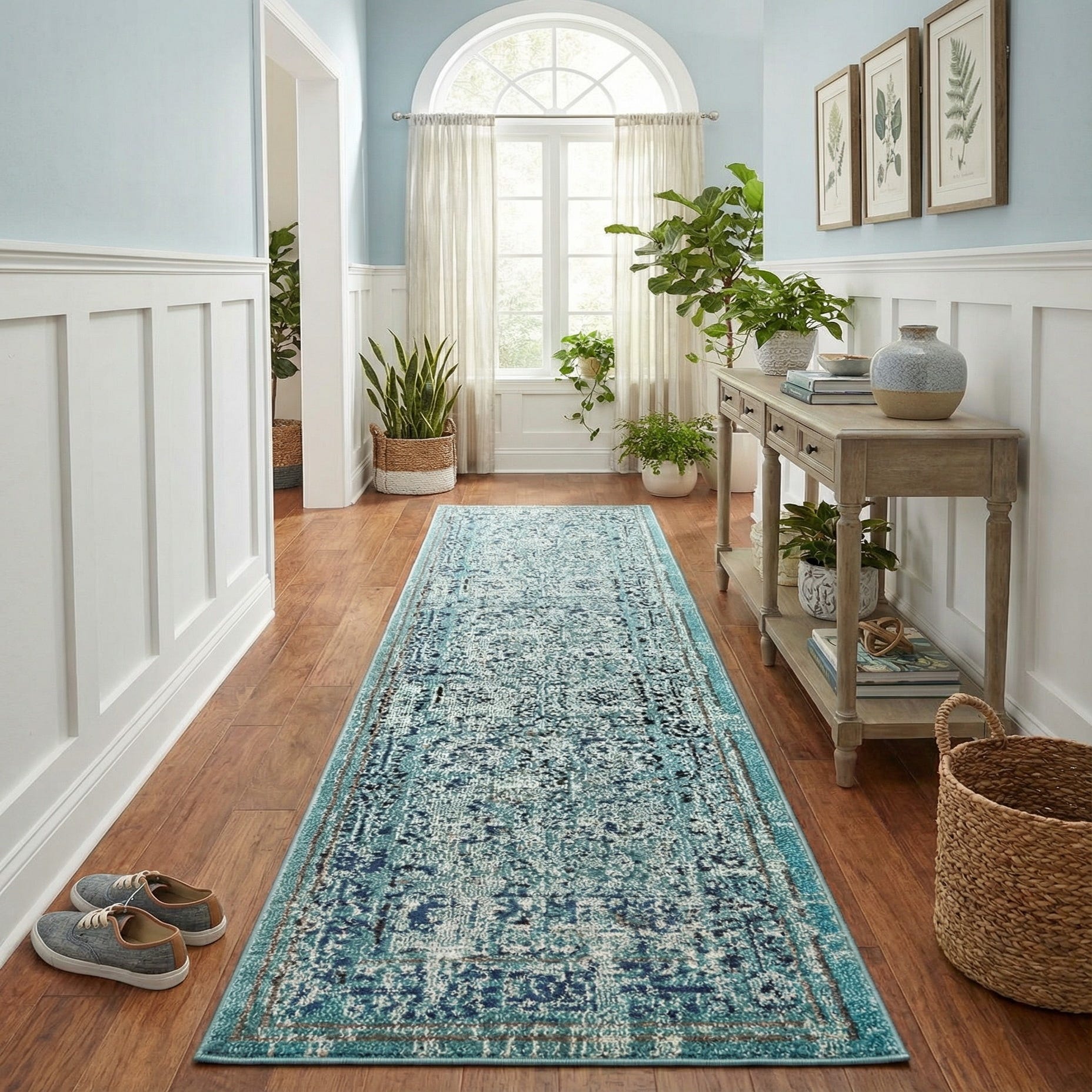 This runner pairs naturally with coastal, transitional, or modern-traditional interiors—think white-washed wood, warm oak floors, or upholstered seating in neutral tones. Use it to define a hallway, anchor a narrow entry, or add color and pattern along the side of a bed; it also layers nicely under a console table to introduce subtle visual interest without overwhelming a space.