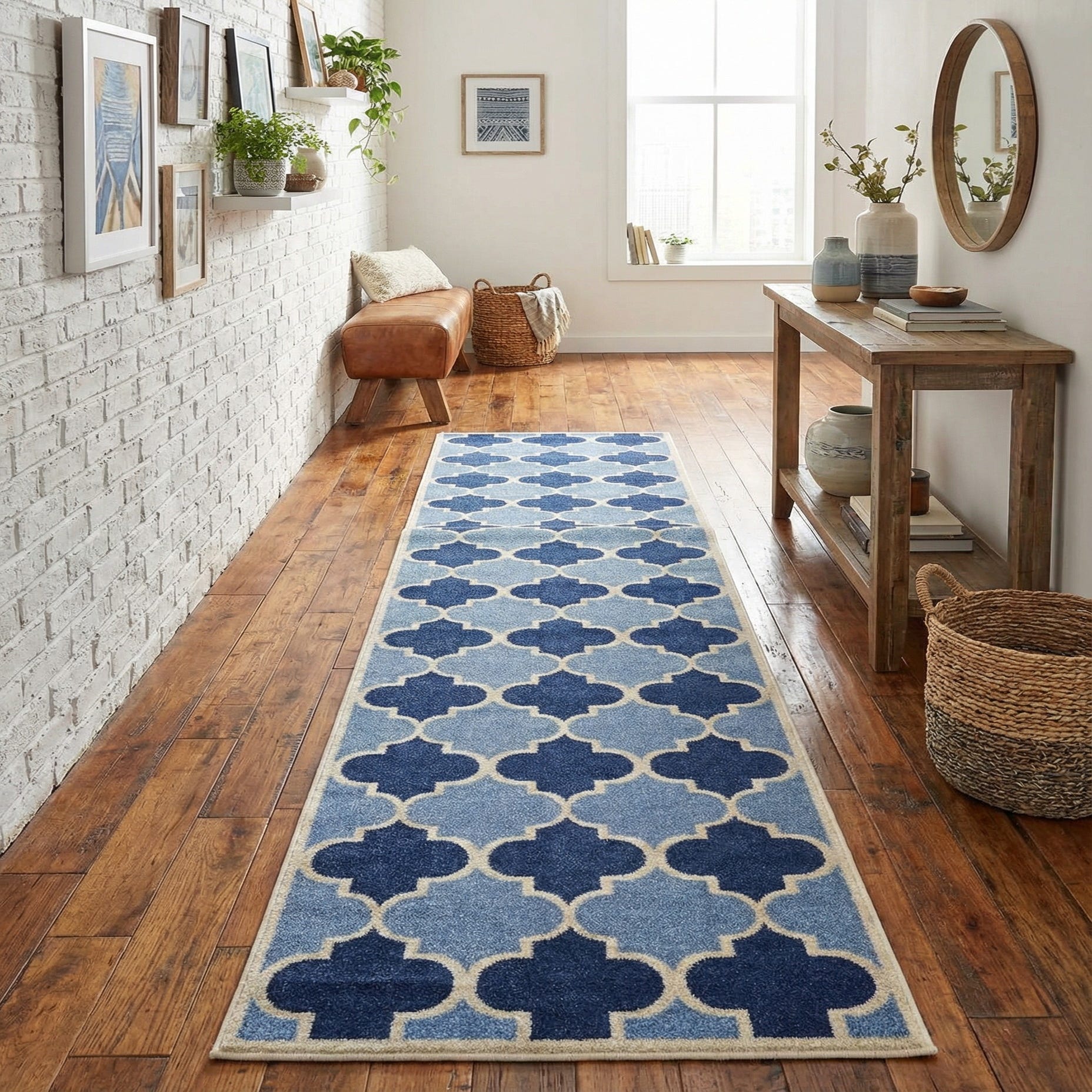 This runner would work well in a variety of interior design scenarios. Its clean geometric pattern and cool color palette make it ideal for contemporary and modern spaces. It could elegantly accent a minimalist decor or serve as a calm counterbalance in a more eclectic setting. The runner's elongated shape is perfectly suited for hallways, entryways, or alongside kitchen cabinetry, providing both decorative appeal and protective coverage for floor surfaces.