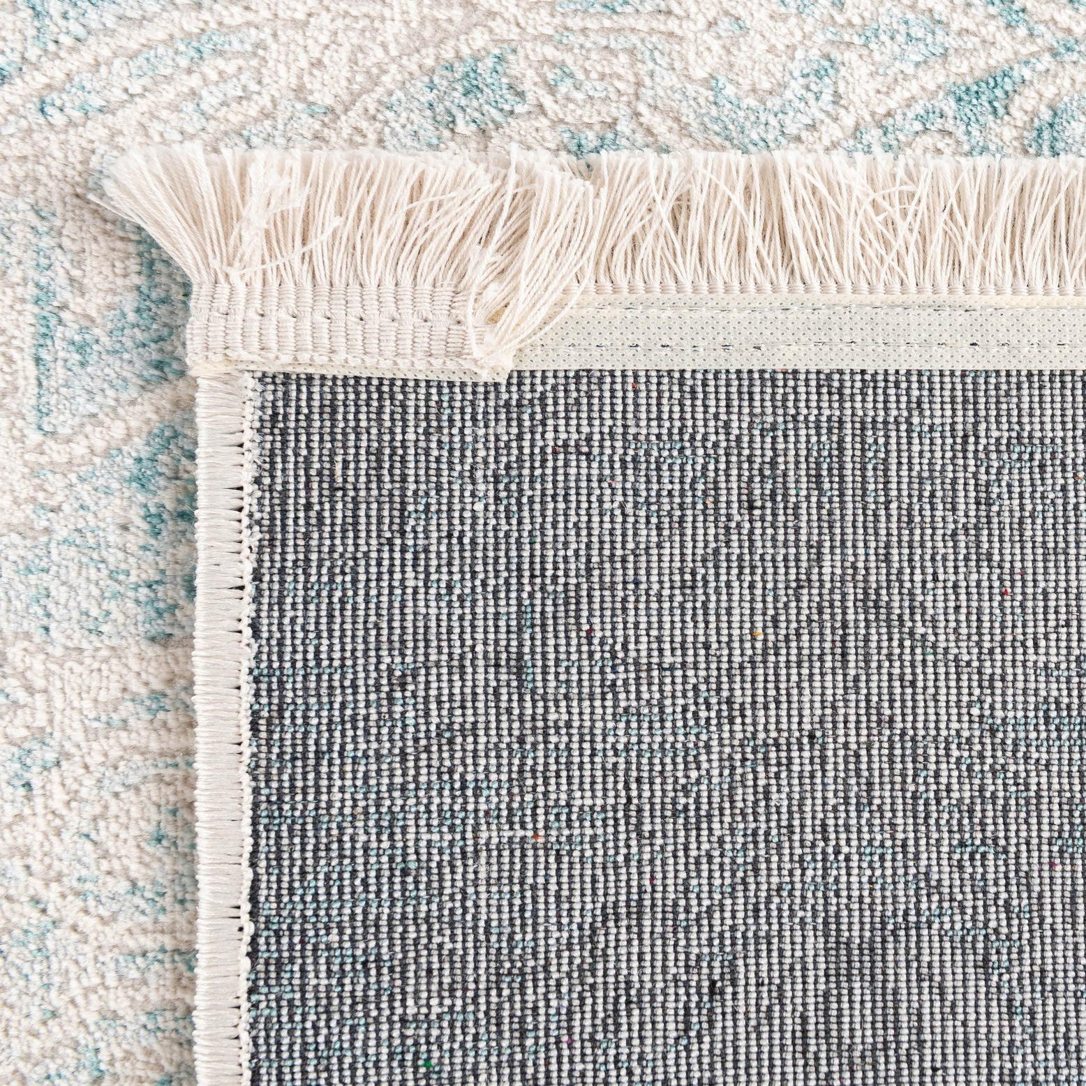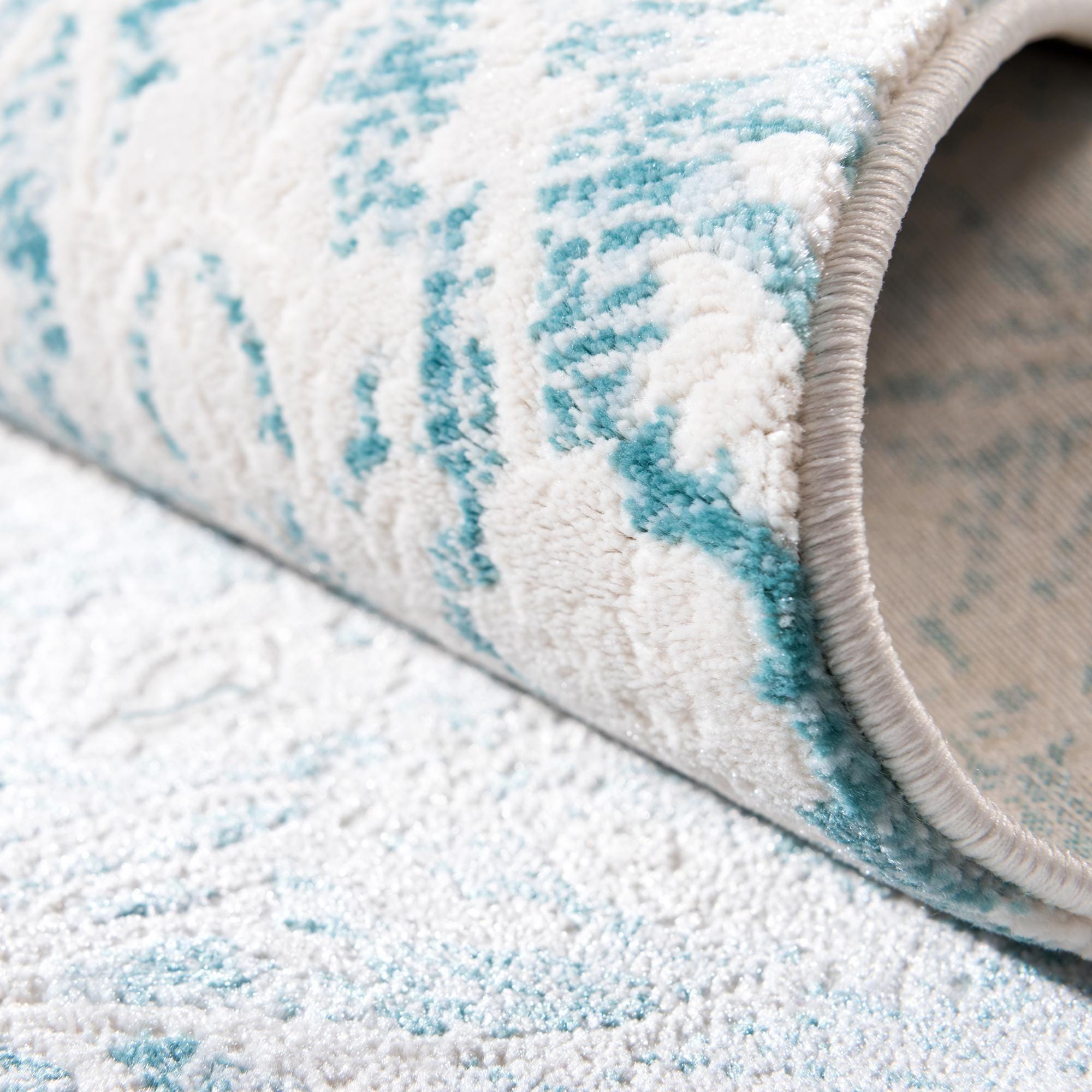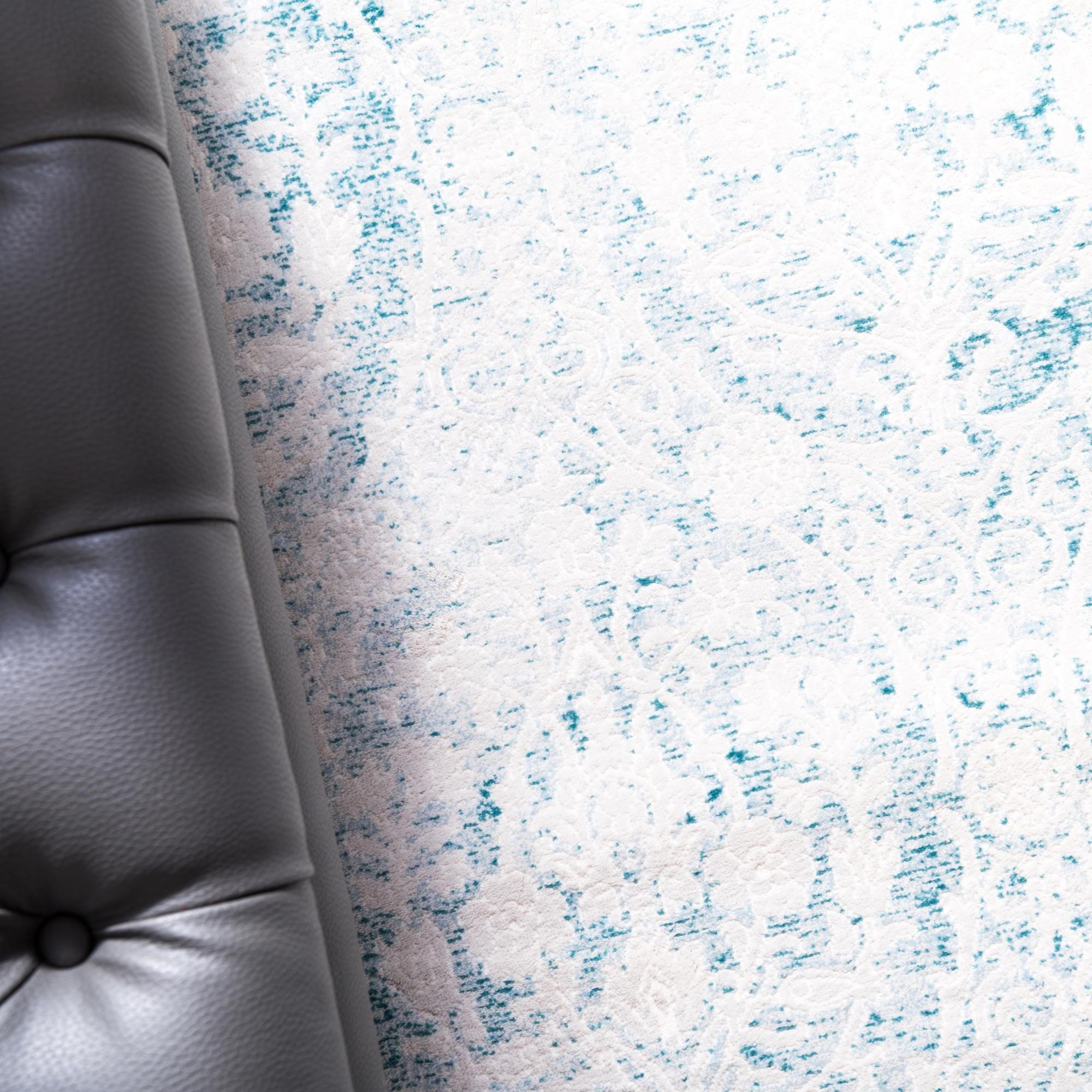 A light blue background sets a calm tone for this runner, with an ivory damask medallion and scrolling floral pattern worked across its length. The motifs are intentionally distressed for a softened, vintage look that keeps the design classic without feeling heavy. Machine-made from 70% polypropylene and 30% polyester, the surface has a low, dense pile with a slight sheen from the polyester fibers and a reassuringly even texture that feels soft underfoot while maintaining structure.