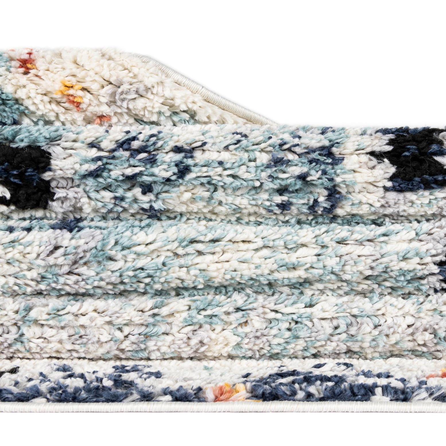 A 10 ft runner rug from the Morocco collection, featuring a light blue, cream, and orange bohemian pattern with a shag pile, ideal for a hallway.