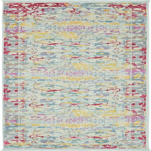 Primary color is Light Blue. Colors in this rug include: Light Blue, Blue, Gold, Red, Violet.