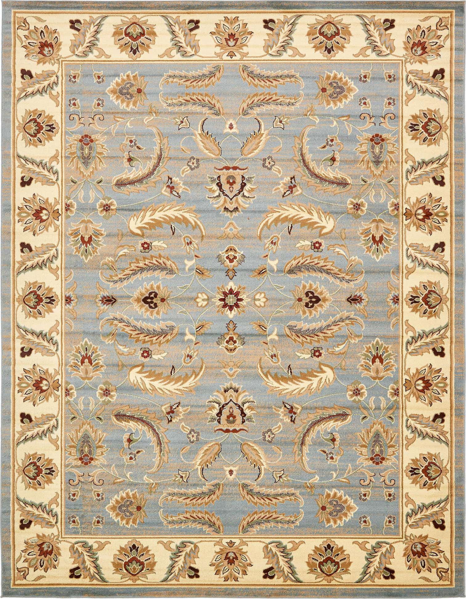 The Aditi collection offers a 10x13 Machine Woven rug crafted from 100% Polypropylene, ensuring durability and ease of care. This piece showcases a light blue background with a meticulously designed pattern featuring accents in brown, cream, green, red, rust red, and tan. Its ornate floral motifs and intricate borders evoke a sense of traditional elegance, yet the palette remains versatile for contemporary spaces.