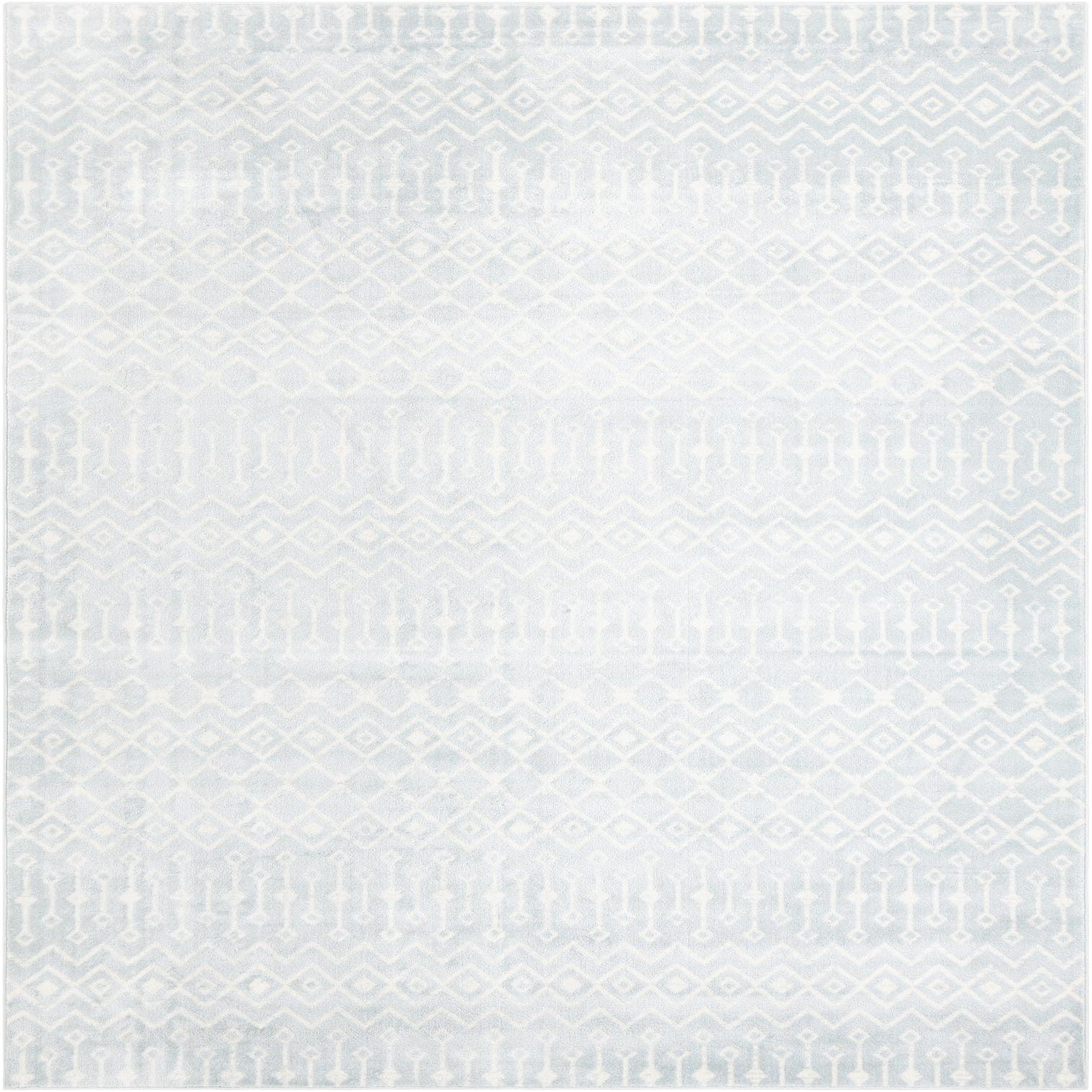 A soft light-blue field sets a calm foundation for a low-contrast ivory trellis pattern made up of diamonds, chevrons and linear motifs arranged in horizontal bands. The design reads like a modern interpretation of traditional tribal motifs, with a gently faded effect that keeps the look airy and restrained. Machine made from 100% polypropylene, the rug has a low-profile, tightly woven pile with a smooth hand and a subtle sheen that catches light, giving the surface a refined, tactile presence underfoot.
