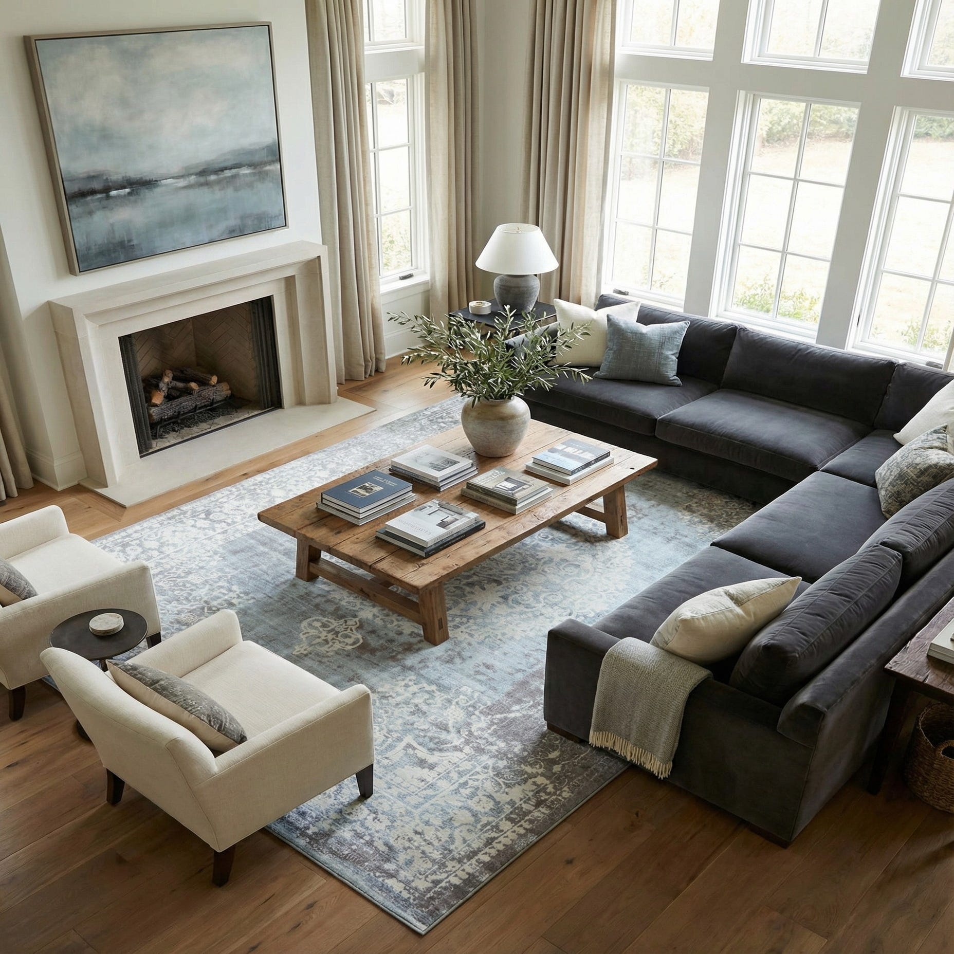 This rug works well as an anchor in a serene living room or under a seating group, and it pairs naturally with light-wood furniture, gray or ivory upholstery, and linen textiles for a relaxed coastal or transitional look. It also suits a soft, layered bedroom palette — try it beneath the bed with bedside benches and brass or matte-black hardware to balance traditional pattern with modern finishes.