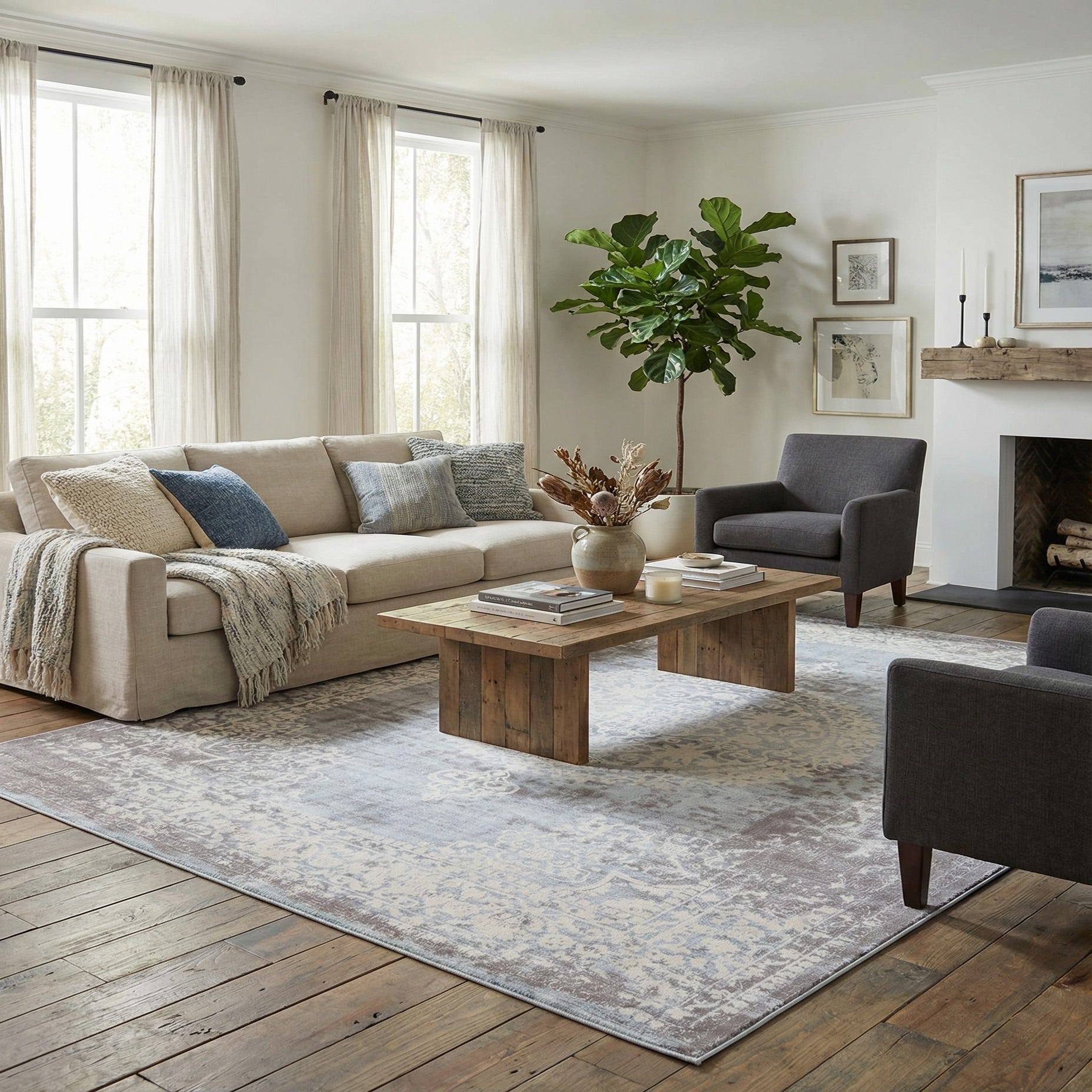 This rug works well as an anchor in a serene living room or under a seating group, and it pairs naturally with light-wood furniture, gray or ivory upholstery, and linen textiles for a relaxed coastal or transitional look. It also suits a soft, layered bedroom palette — try it beneath the bed with bedside benches and brass or matte-black hardware to balance traditional pattern with modern finishes.
