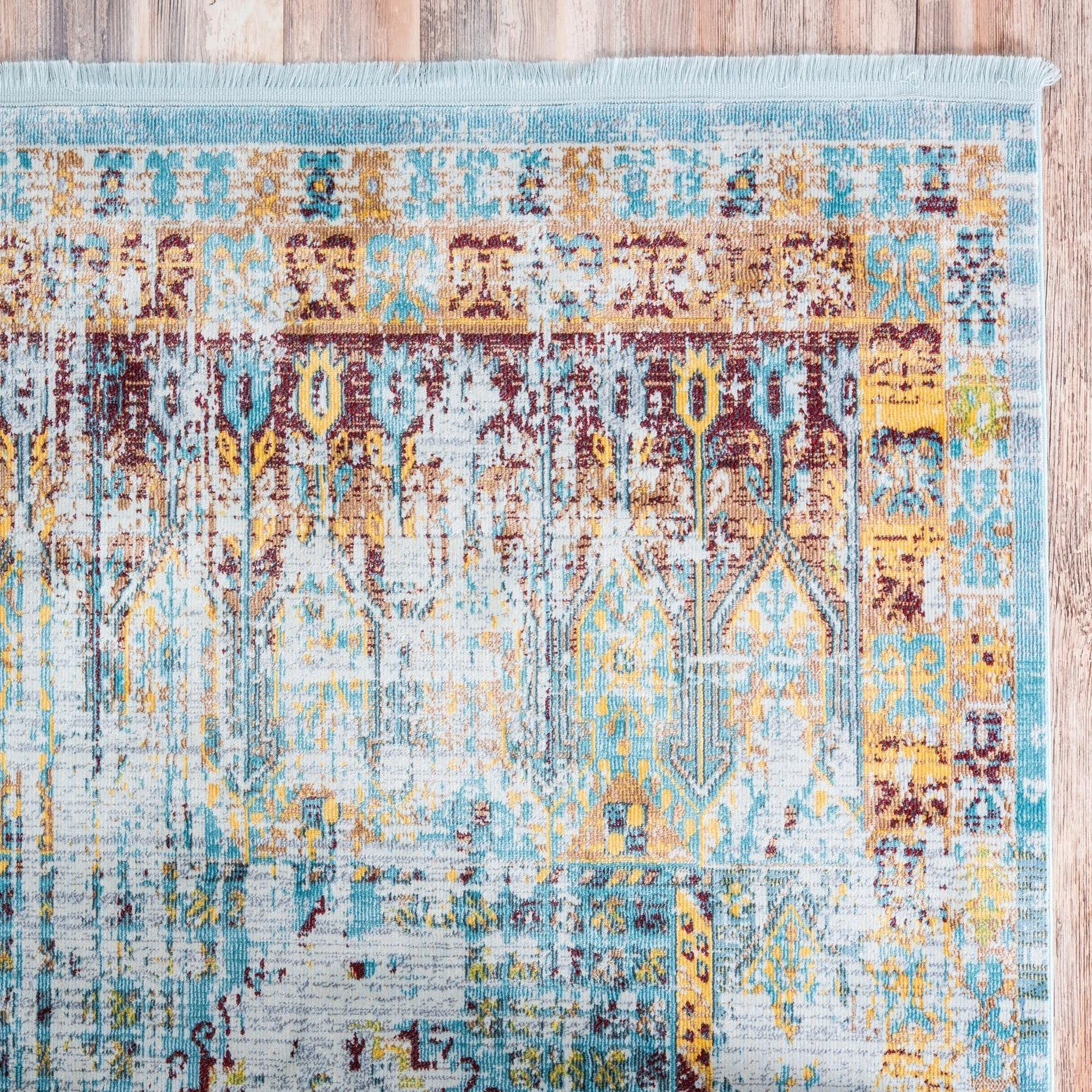 A layered, vintage-inspired medallion rug with a worn, hand-distressed appearance, this piece centers on a cream diamond medallion set against a light blue background. Intricate geometric and floral motifs thread through the field and border, where bands of yellow and tan sit beside accents of beige and deeper blue. Small pops of red and green appear in the finer details, giving the pattern a lived-in, collected feel without competing with the overall colorway.