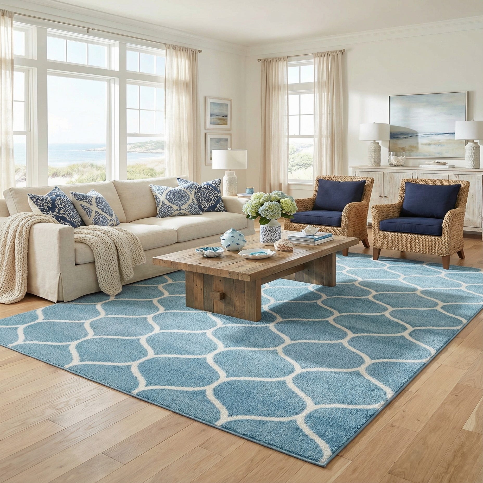 Works well in coastal, transitional, or contemporary interiors — pair it with white or natural wood furnishings, linen upholstery, and brushed-metal accents for a light, airy feel. It also complements bedrooms, living rooms, or nurseries where a gentle pattern and cool color palette bring cohesion; place it under a sofa grouping to anchor seating or beneath a dining table to introduce subtle visual interest.