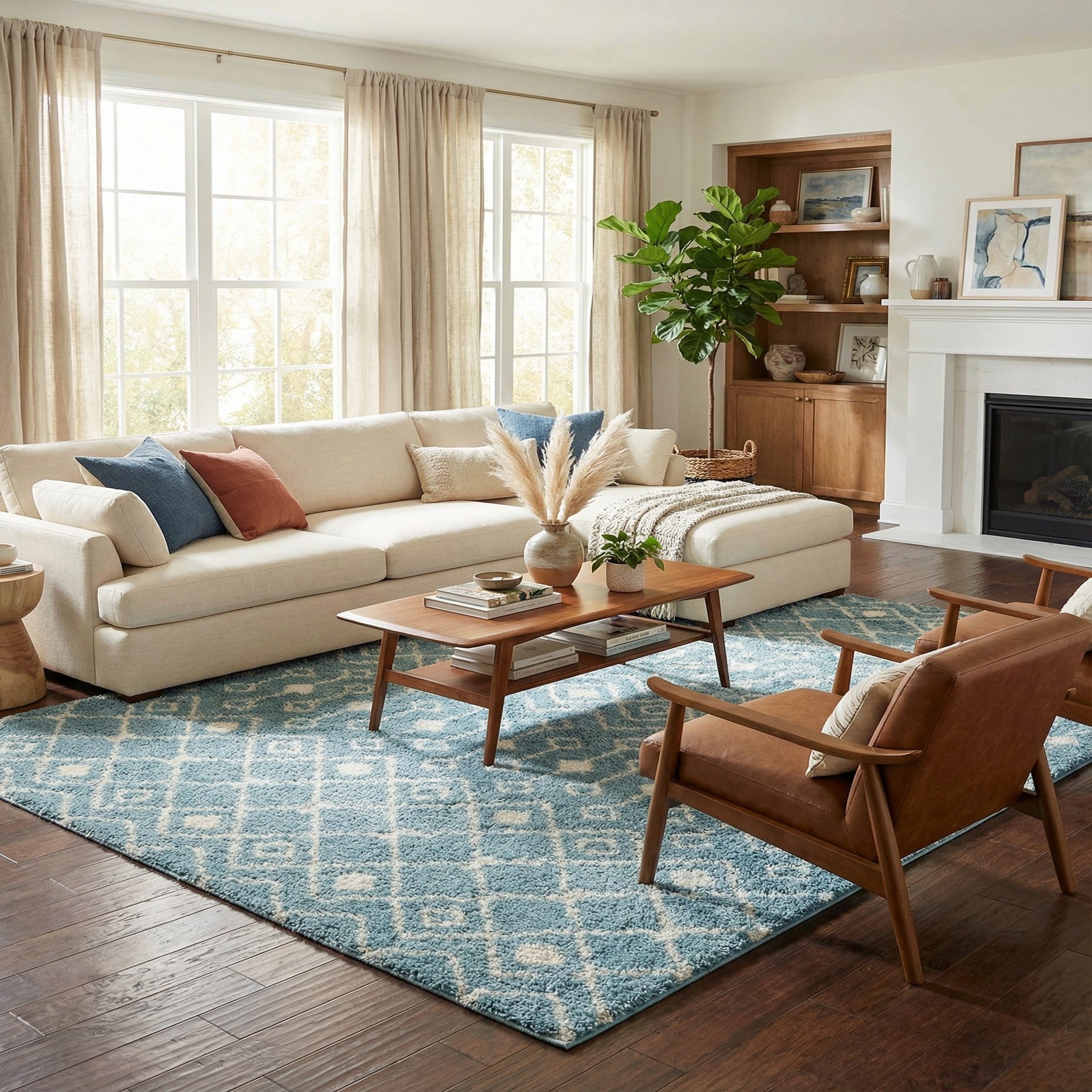 This rug would work best in casual and relaxed interiors — think breezy coastal living rooms, light-filled bedrooms, or a cozy reading nook. It also complements cottage and modern farmhouse styles, pairing nicely with whitewashed woods, linen upholstery, rattan accents, and soft navy or sandy neutrals. Use it under a seating group to anchor conversation areas or layer it in a bedroom to add a soft, inviting surface to step onto.
