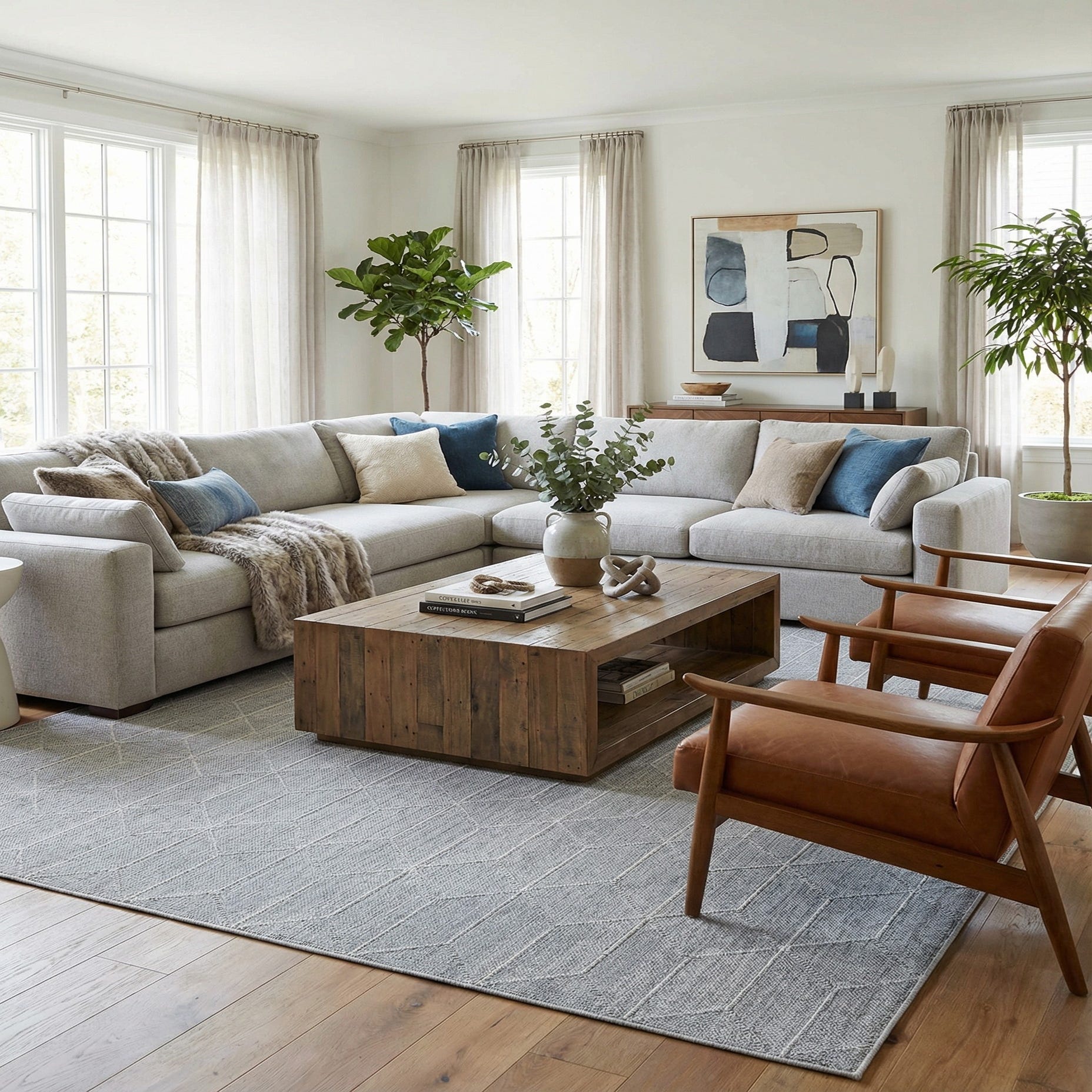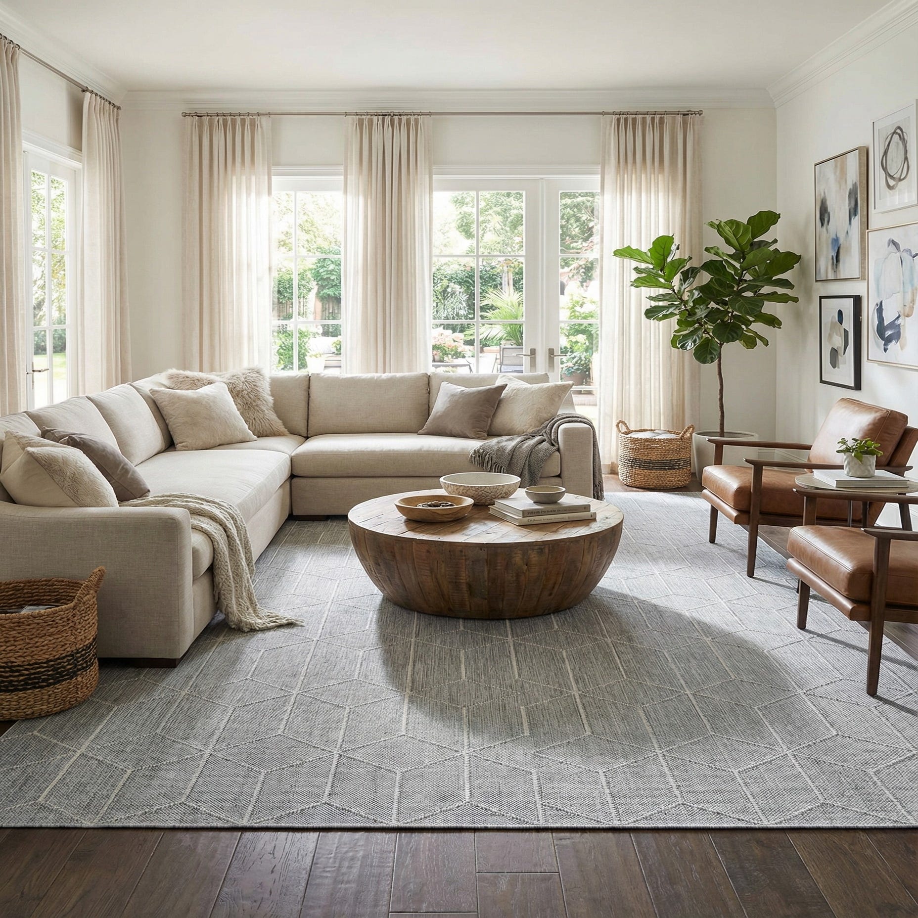 Underfoot the rug feels firm and low-pile, the slight texture of the pattern adding a gentle tactile interest that pairs well with both indoor and outdoor seating areas. Place it beneath a patio dining set or on a covered porch to introduce a calm, contemporary base; it also complements coastal, modern, Scandinavian, and transitional interiors—try it with whitewashed wood, rattan, navy accents, or minimalist metal furniture for a balanced look.