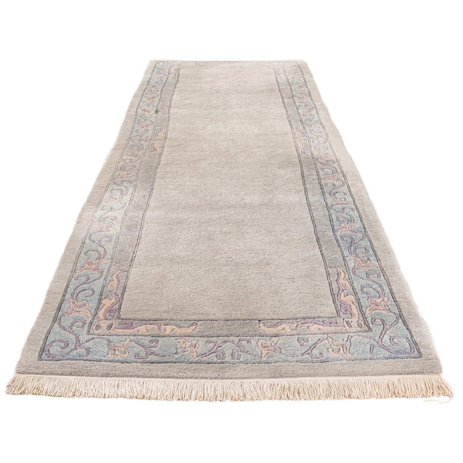 A handmade 11 ft wool runner rug in light blue and beige with an intricate oriental border pattern, perfect for a hallway.