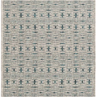 A 12 ft runner rug from the Outdoor Lattice collection, featuring a modern trellis pattern in shades of blue and light blue on a flatweave texture.