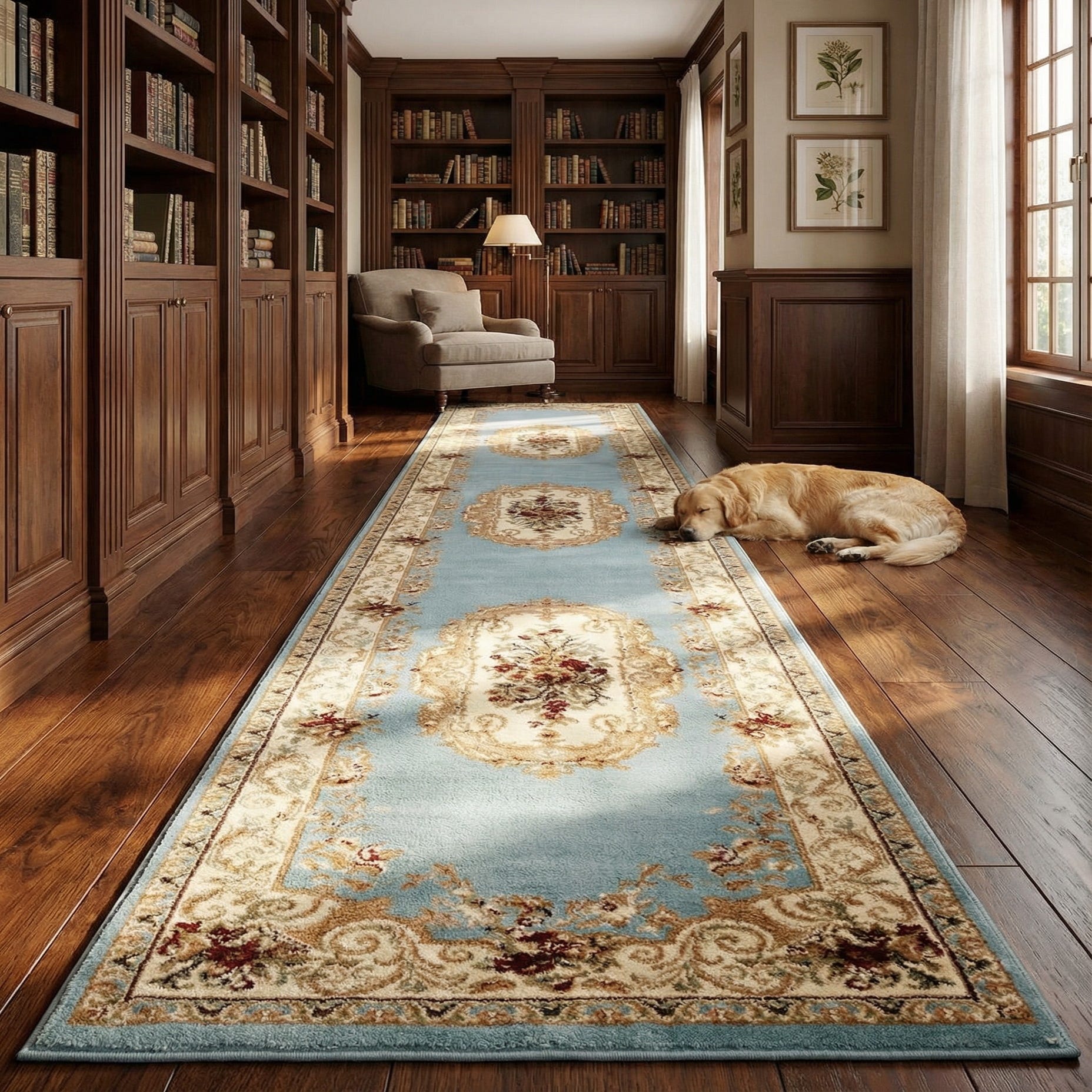 A 13 ft light blue traditional runner rug with an ornate cream and gold border, featuring floral medallions in red and brown.