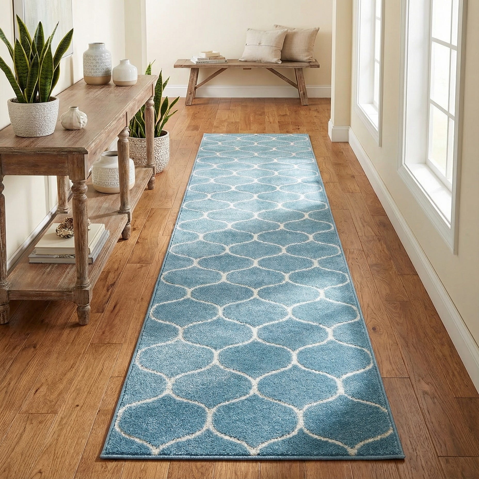 As a runner, this piece is well suited to hallways, entryways, stair landings, and galley kitchens where a long, narrow footprint benefits from a defined path of pattern and color. It pairs naturally with coastal and transitional interiors — think light-wood floors, white trim, navy or sand accents, and linen upholstery — and can add a fresh, tailored touch to a modern farmhouse or cottage-style space. The light blue and ivory palette keeps the look bright without overpowering surrounding furnishings.
