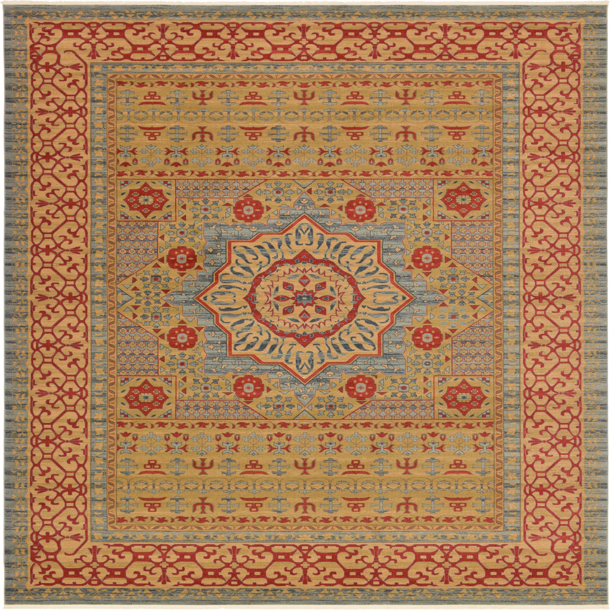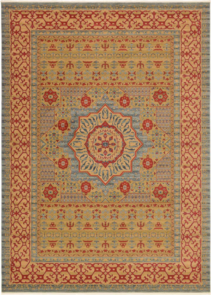 Primary color is Light Blue. Colors in this rug include: Light Blue, Light Brown, Light Green, Red, Navy Blue.