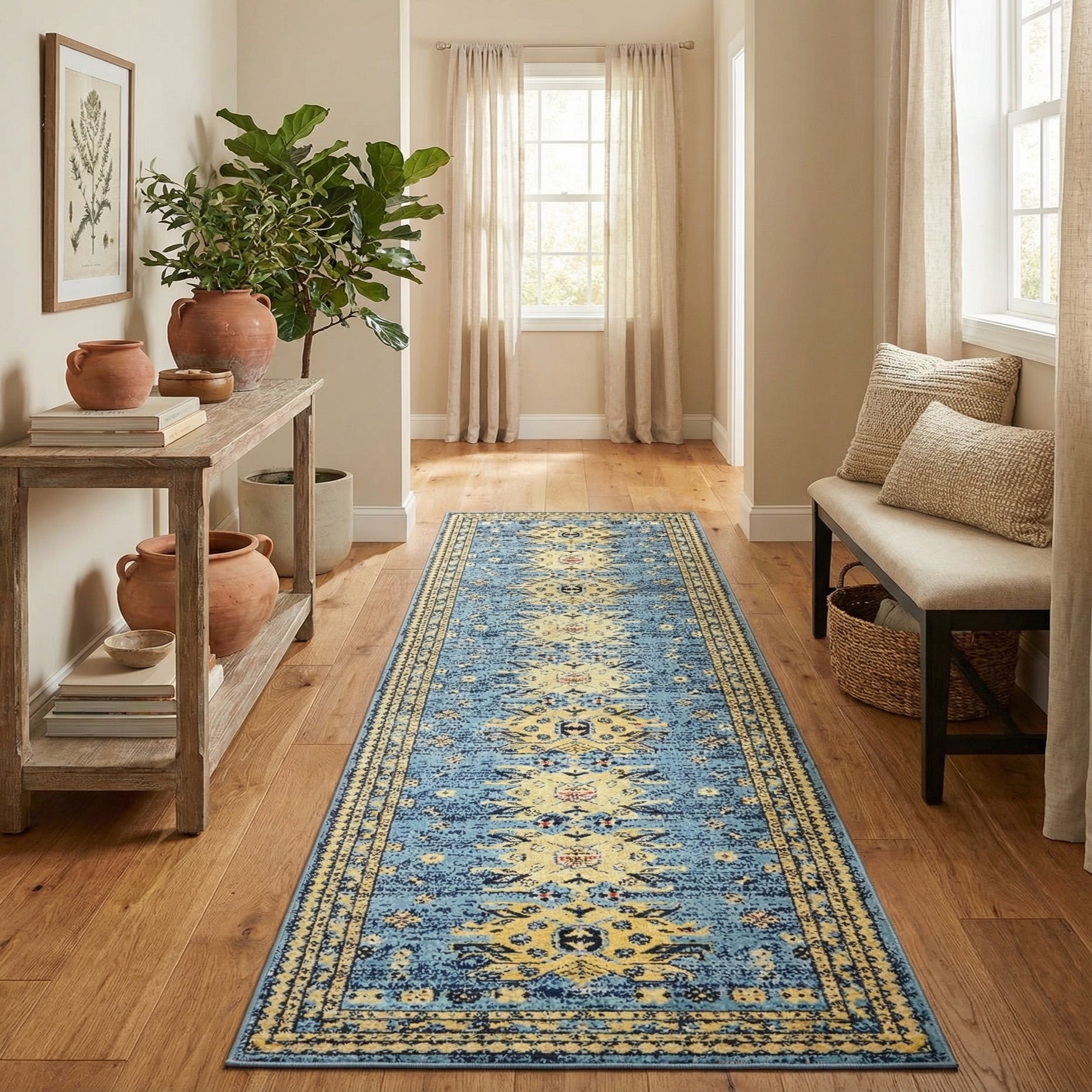 A 16 ft runner rug from the Rugs.com Heris collection, featuring a light blue background with traditional Southwestern and tribal medallion patterns in yellow, black, and red, perfect for a hallway.