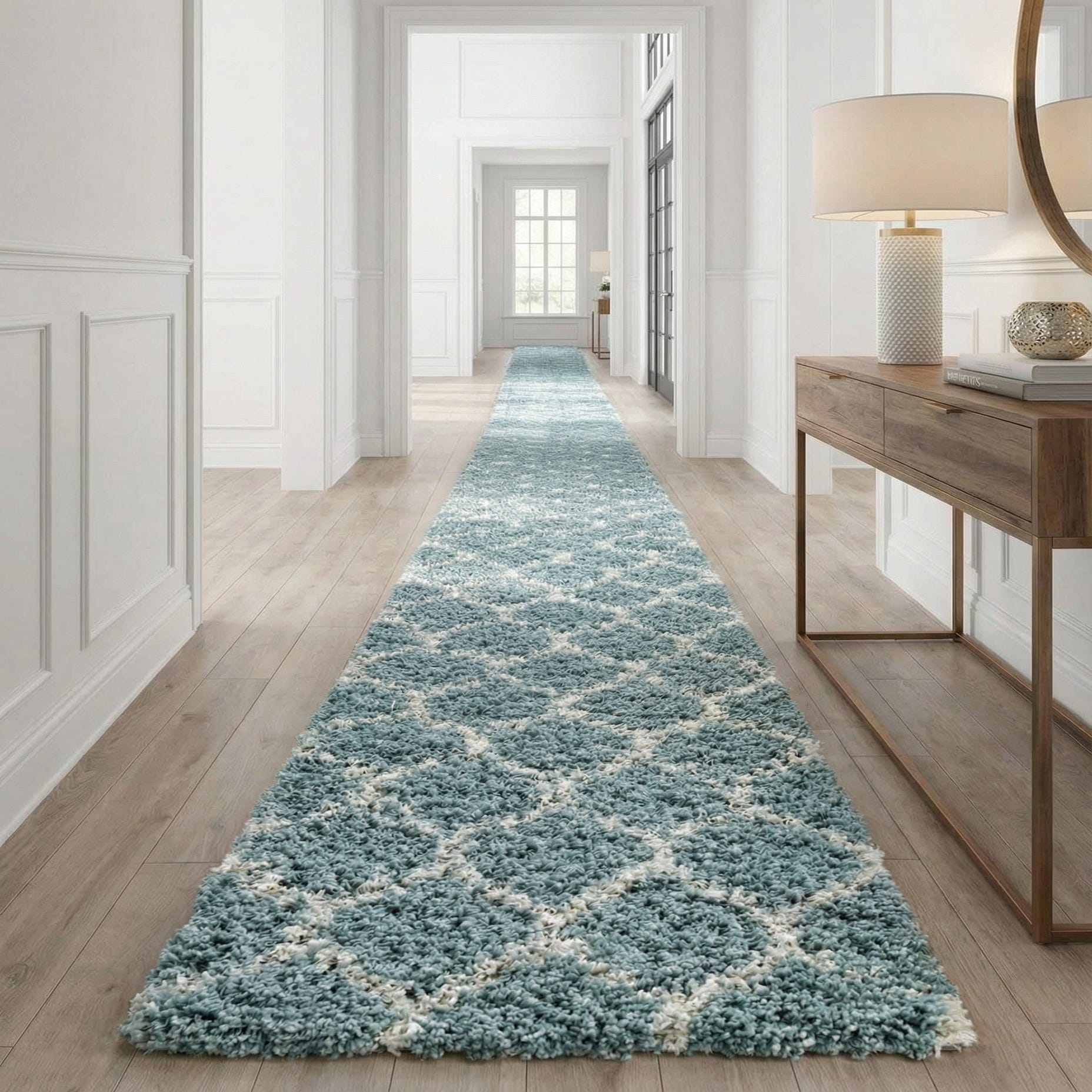This runner works well in corridors, entryways, and alongside beds where a longer rug can anchor a pathway and add a layer of texture. Pair it with light wood floors and white trim for a coastal or cottage look, use it to soften contemporary furniture in a transitional living space, or bring a touch of color and comfort to a nursery or bathroom hallway. The calm palette and classic lattice design make it easy to coordinate with neutral furnishings, pale blues, and soft metallic accents.