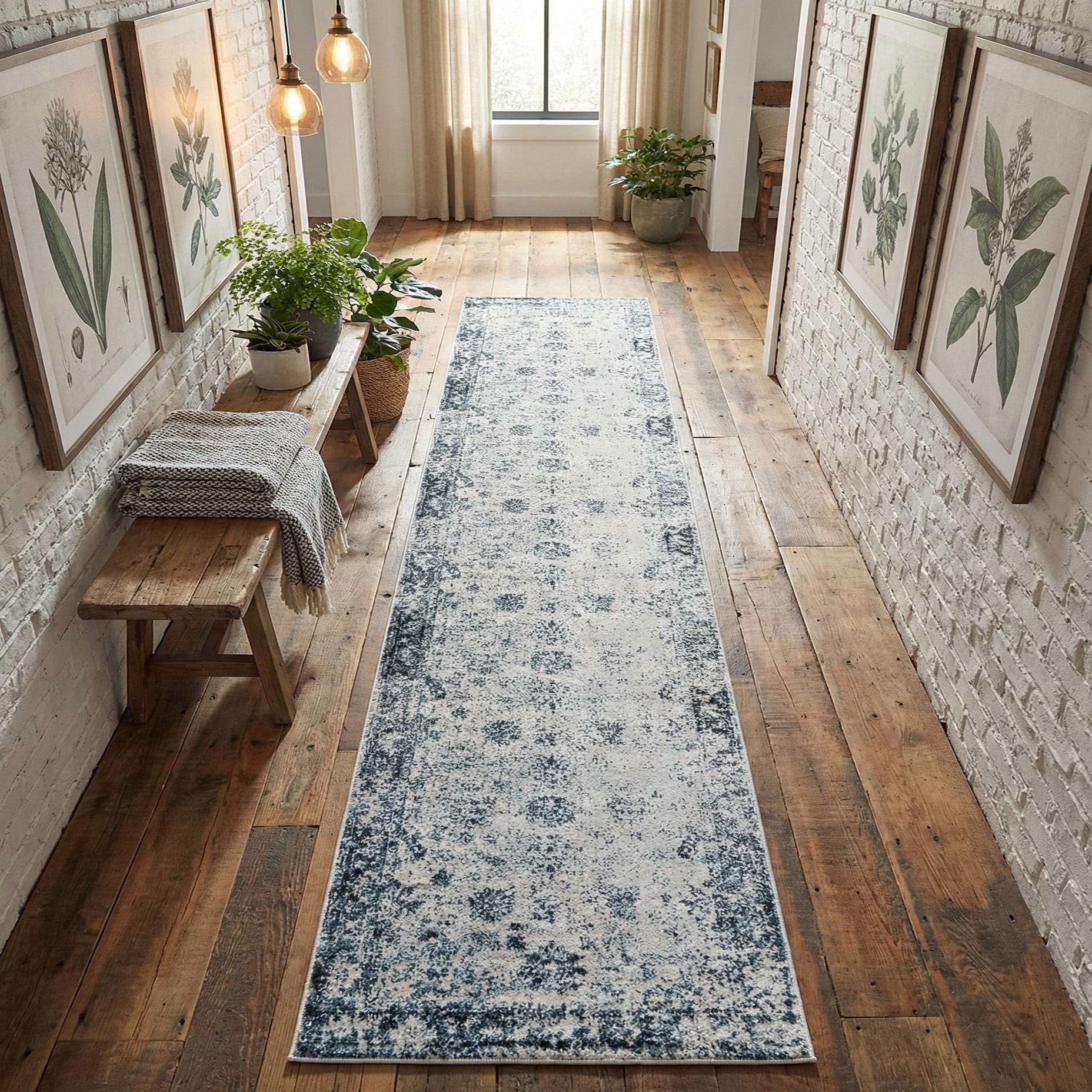 Designed as a runner, it works well in hallways and entryways or alongside beds and in narrow kitchen aisles. The light blue background and cool gray and ivory accents pair nicely with pale wood floors, white or soft gray walls, and navy or charcoal furnishings. Use it to add calm color to coastal or transitional interiors, to soften a contemporary space, or to introduce layered texture in a modern farmhouse scheme.