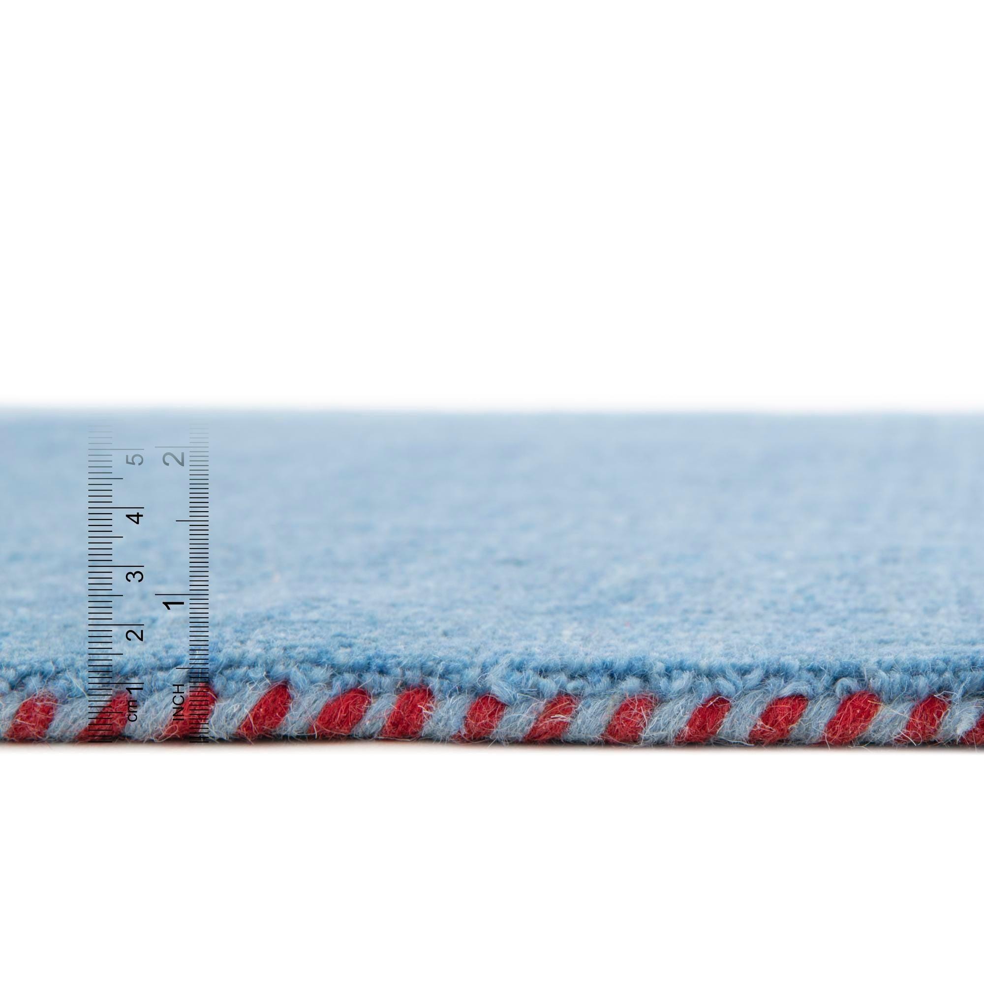With its solid pattern and light blue background, this rug is particularly well-suited for use in hallways or elongated spaces where it can serve as a visual guide, while adding color and texture. Thanks to its woolen construction, the piece also provides a durable surface, able to withstand high foot traffic areas such as entryways or corridors within the home or office environments.