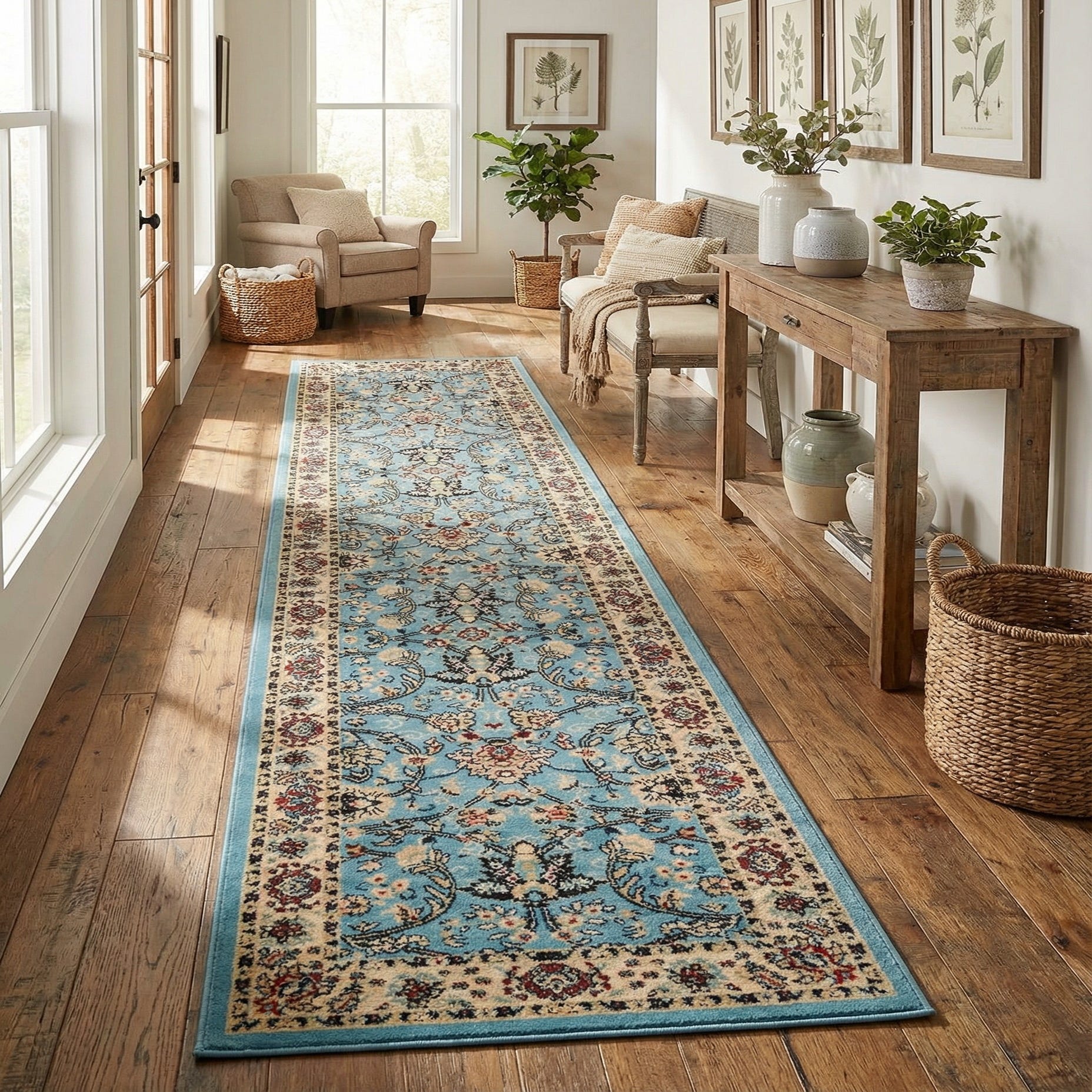 A 16 ft runner rug from the Yasmin collection, featuring a light blue background with intricate traditional Oriental floral patterns in cream, black, and red, perfect for a hallway.