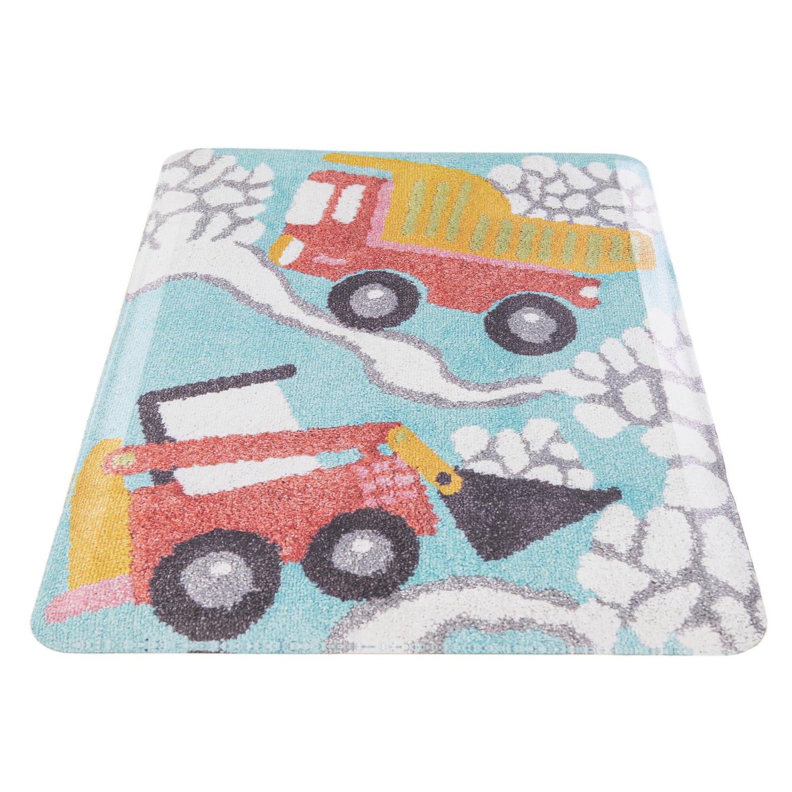 A rectangular 2x3 light blue rug featuring a vibrant, playful design of a red dump truck and a red excavator with yellow accents, driving on a white and gray road, surrounded by white and gray clouds.