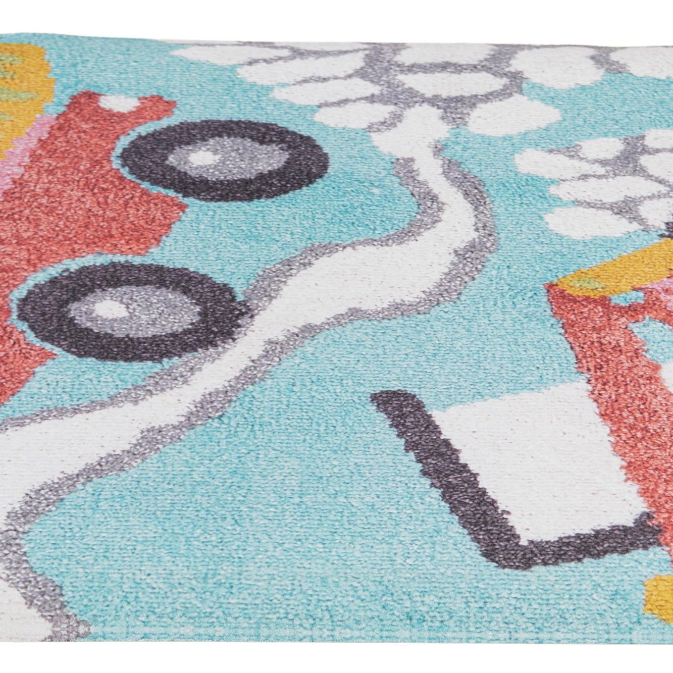Primary color is Light Blue. Colors in this rug include: Light Blue, Black, Ivory, Red, Yellow, Pink.