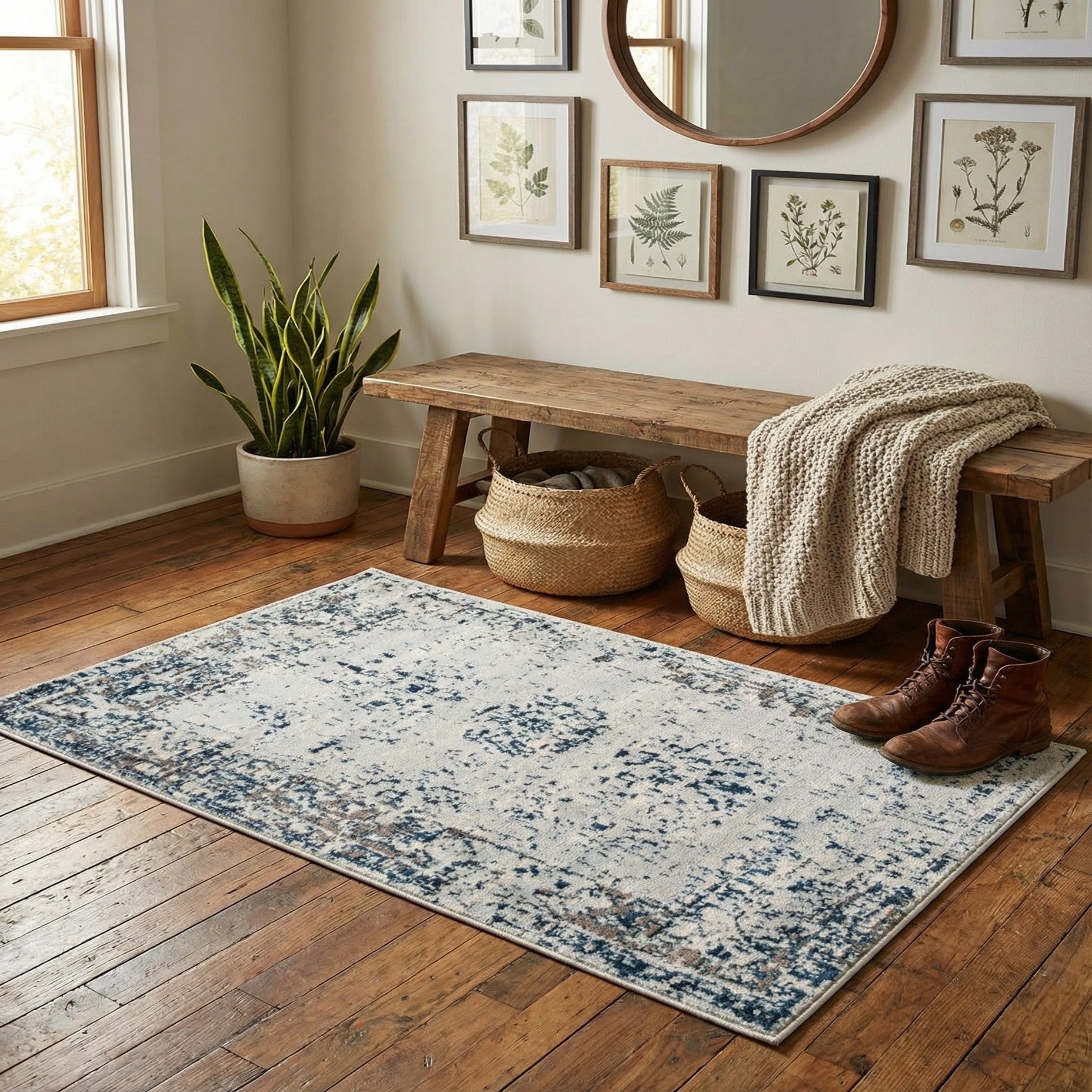 Made by machine of 100% polypropylene, the surface has a low, smooth pile that feels softly supportive underfoot and lies flat against the floor. It works well as an entryway accent, a bedside layer, or in front of a sink or vanity, and pairs cleanly with light woods, navy or gray upholstery and brass or matte-black metal accents. Style pairings include coastal, modern farmhouse, Scandinavian and transitional interiors where a subtle vintage touch and cool color palette are desired.