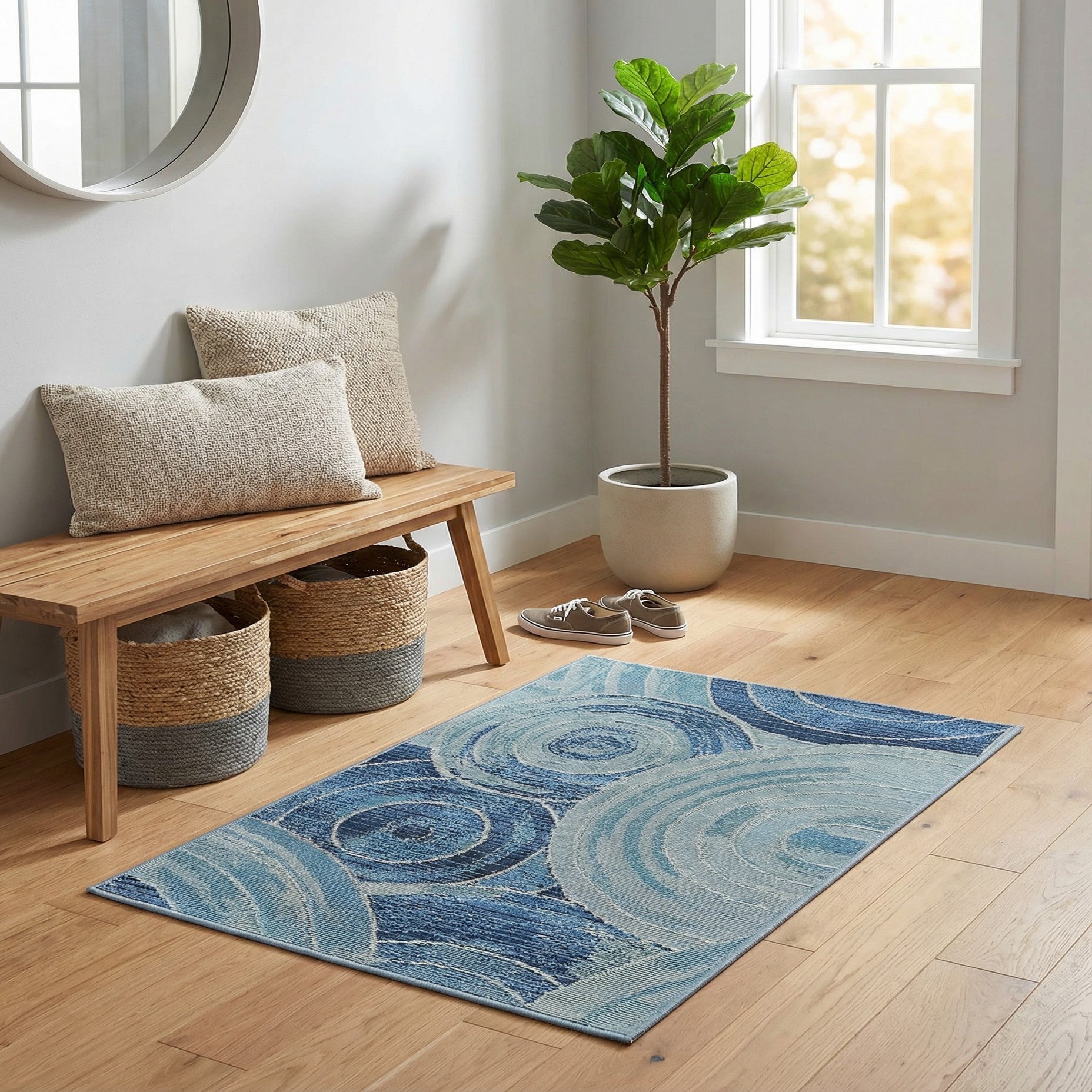 This compact piece works well as an accent in entryways, on a covered porch, or beside a bed where a splash of cool color is needed. It pairs naturally with coastal, contemporary, or transitional decor: try it with light wood or white-painted furniture, navy cushions or drapery, and metal or wicker accents to bring the blues into the room’s palette. The restrained color story and graphic design also make it a good choice for layering over a larger neutral rug to add pattern without overwhelming the space.