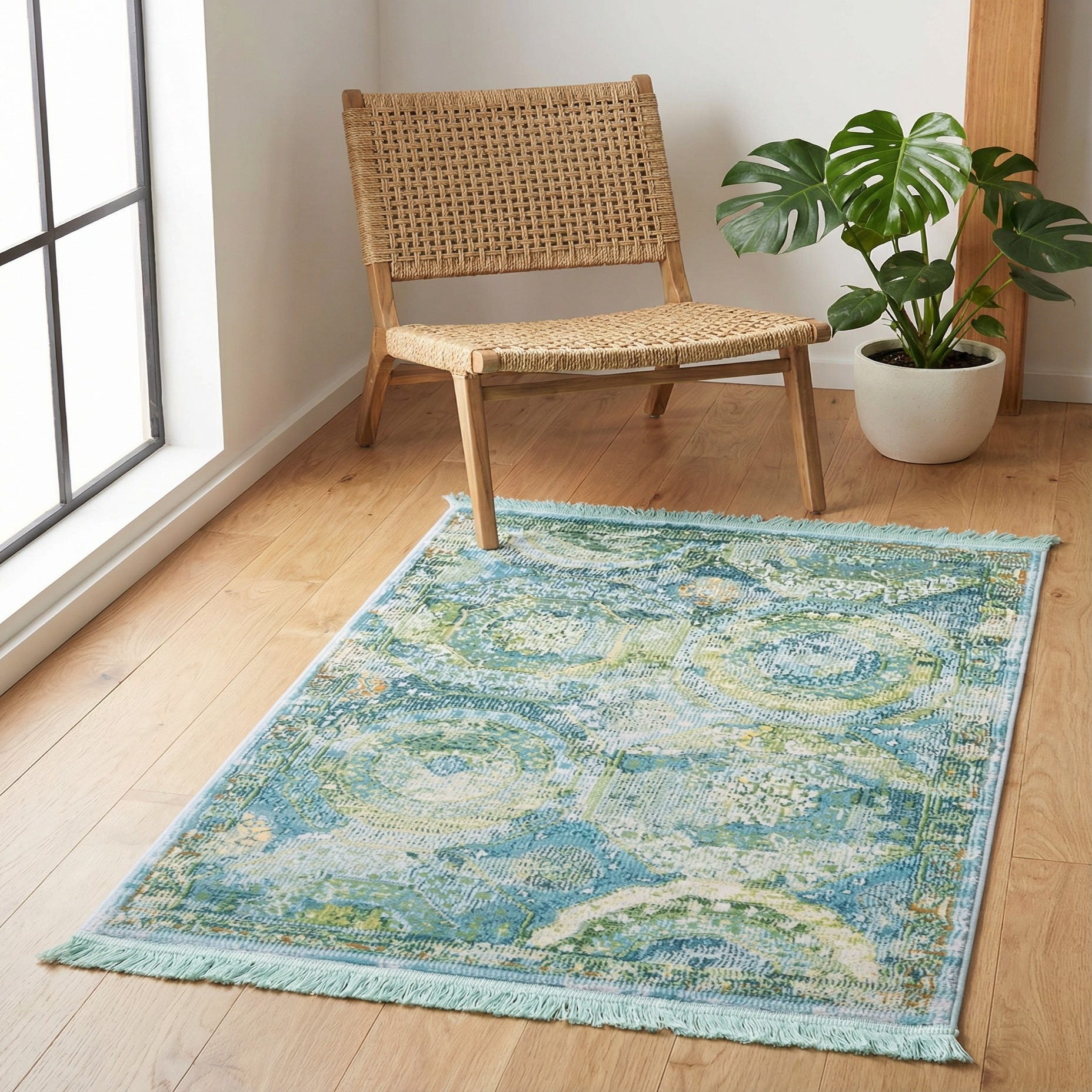 Sized to function as an accent, this piece works well in small entryways, at the foot of a bed, in front of a kitchen or bathroom sink, or layered over a larger rug to introduce color and pattern. Its coastal-to-cottage palette pairs nicely with light wood furniture, white or ivory upholstery, woven textures and muted metal finishes, and it fits comfortably in relaxed contemporary, coastal, cottage, or transitional interiors.