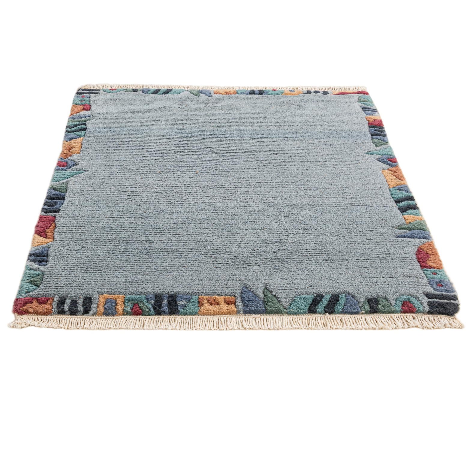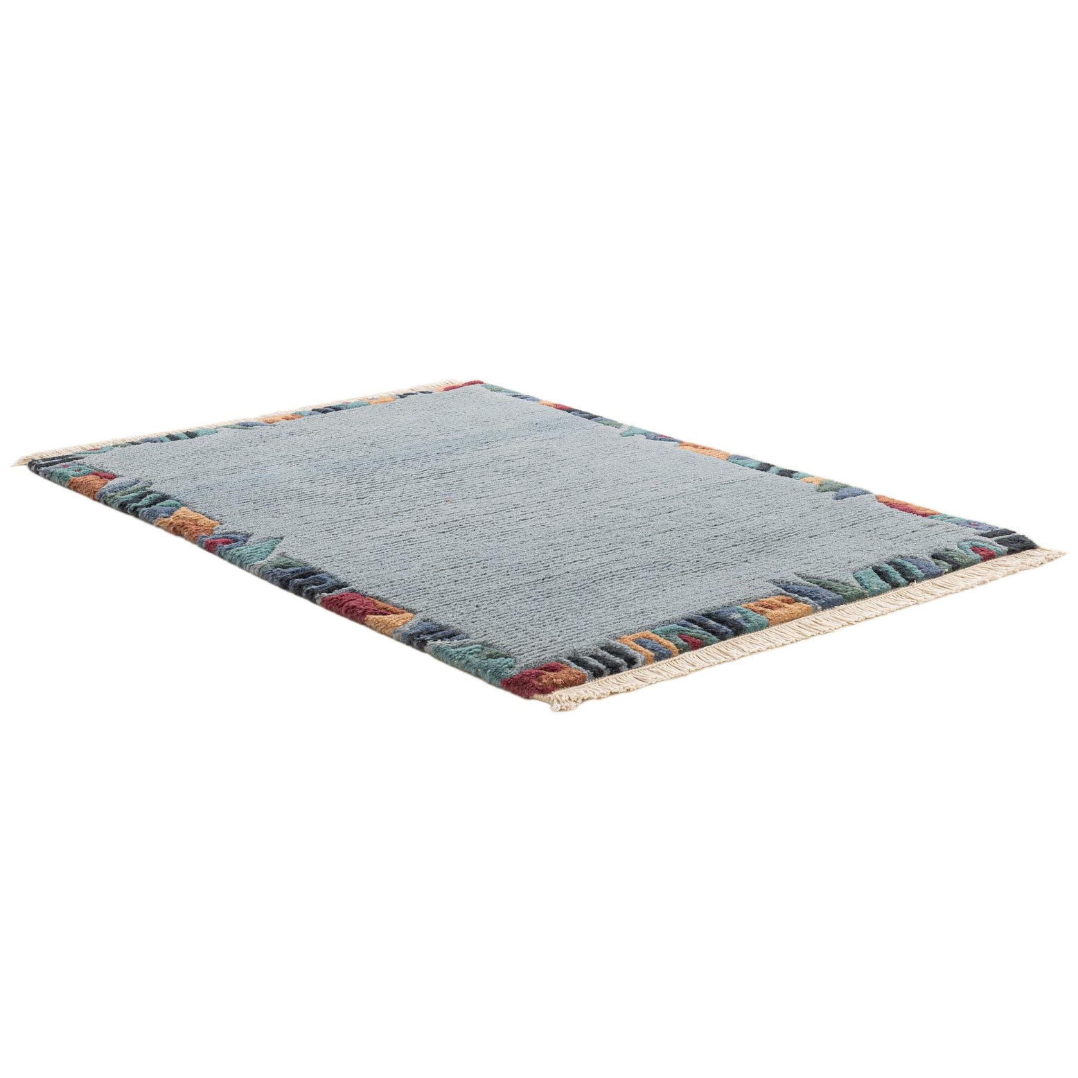 A 2x3 rectangular light blue wool rug with a colorful abstract border and fringe, ideal for an entryway.