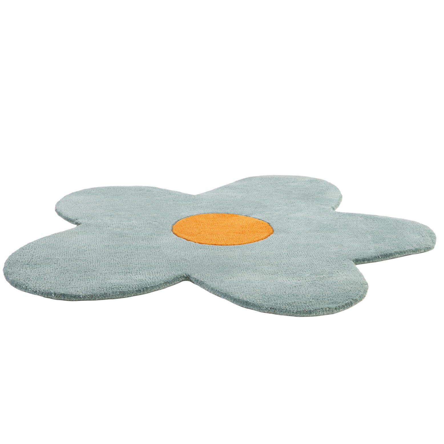 A light blue flower-shaped rug with an orange center, crafted from wool, perfect for a child's room.