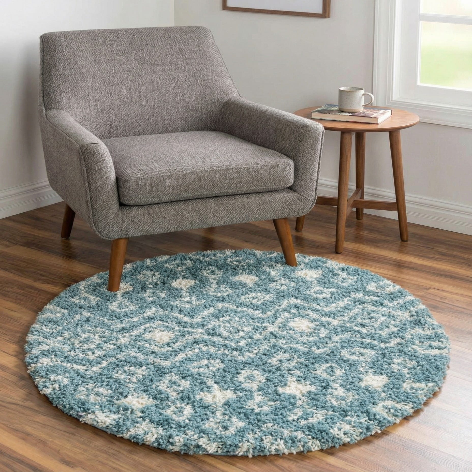 This round shag works well wherever you want to add softness and pattern without overwhelming a room — think a cozy reading nook, layered beneath a small coffee table, or placed under a round bistro set. It pairs nicely with coastal, modern farmhouse, and boho interiors; combine it with light woods, rattan or wicker accents, crisp linens, and pale metallics to bring out the light-blue and ivory palette.
