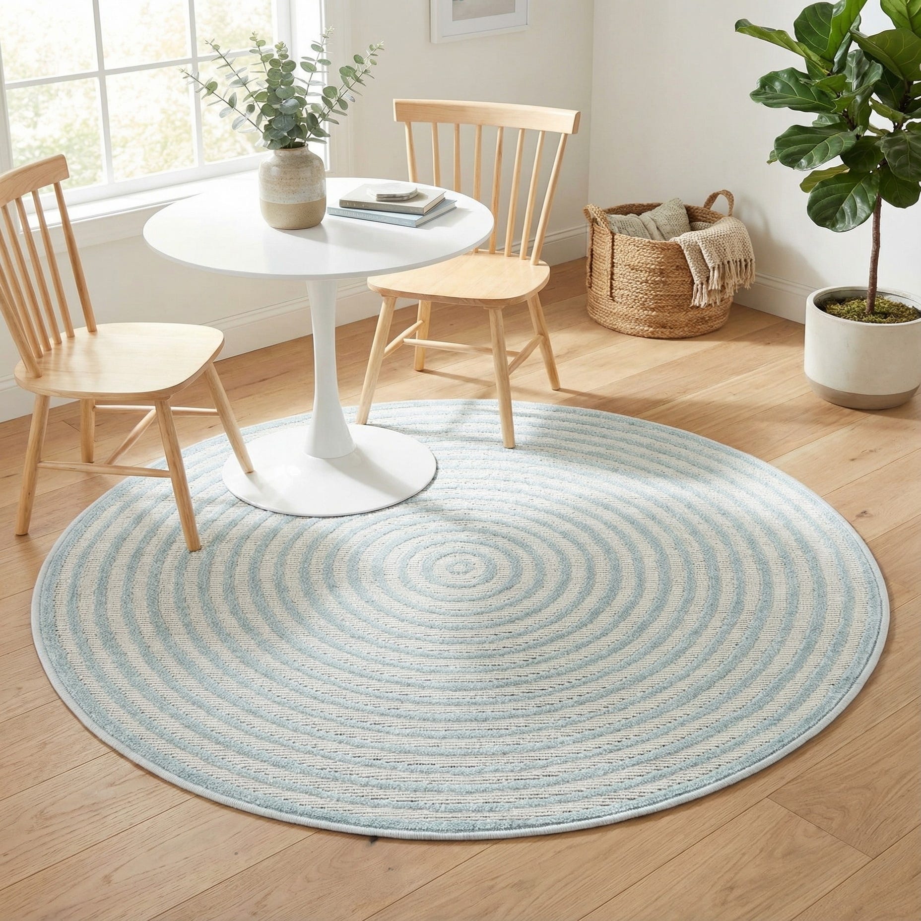 Well-suited for outdoor living areas and casual interiors, this round rug works nicely beneath a small bistro set, on a covered patio, or in a sunroom to anchor a seating nook. Pair it with natural materials like rattan or teak, whitewashed wood finishes, and linen or cotton textiles for a coastal or relaxed contemporary aesthetic; it also layers easily over a larger neutral rug to add a focused touch of color and pattern.